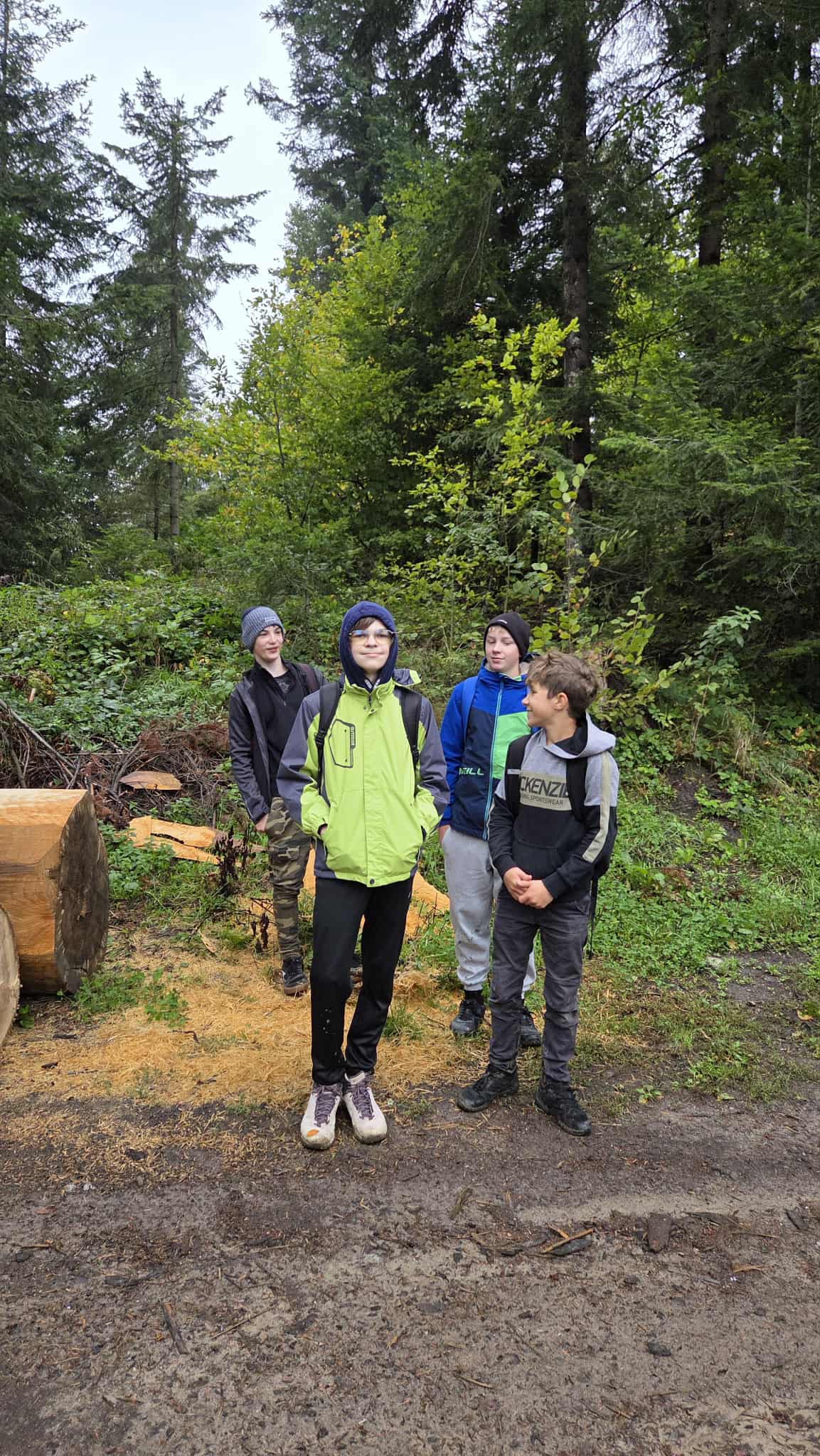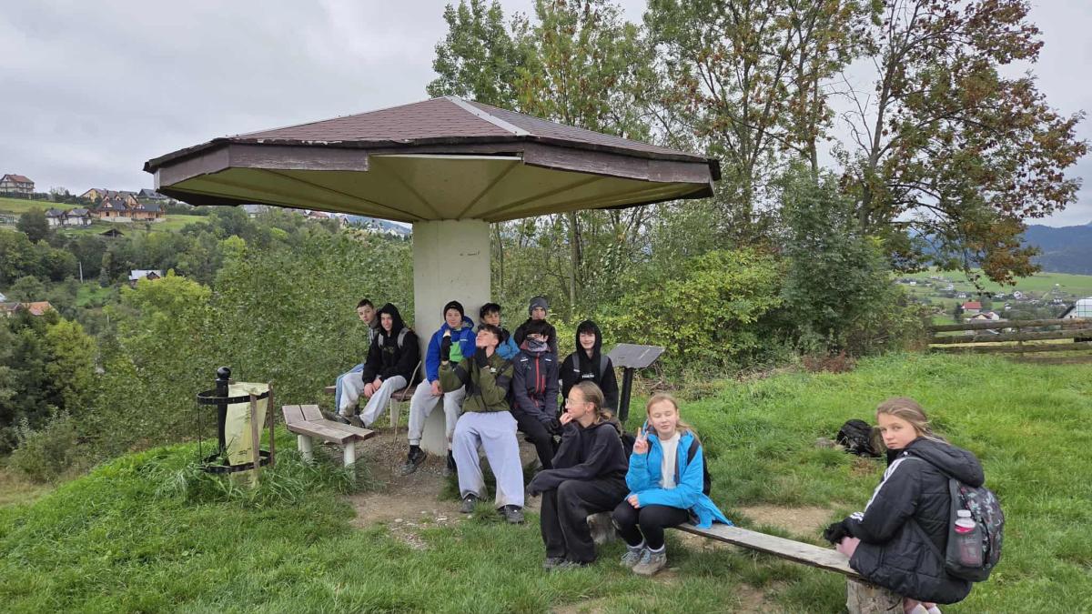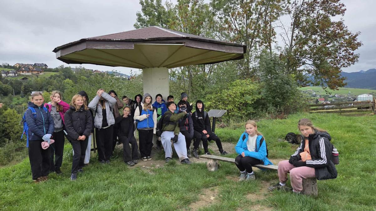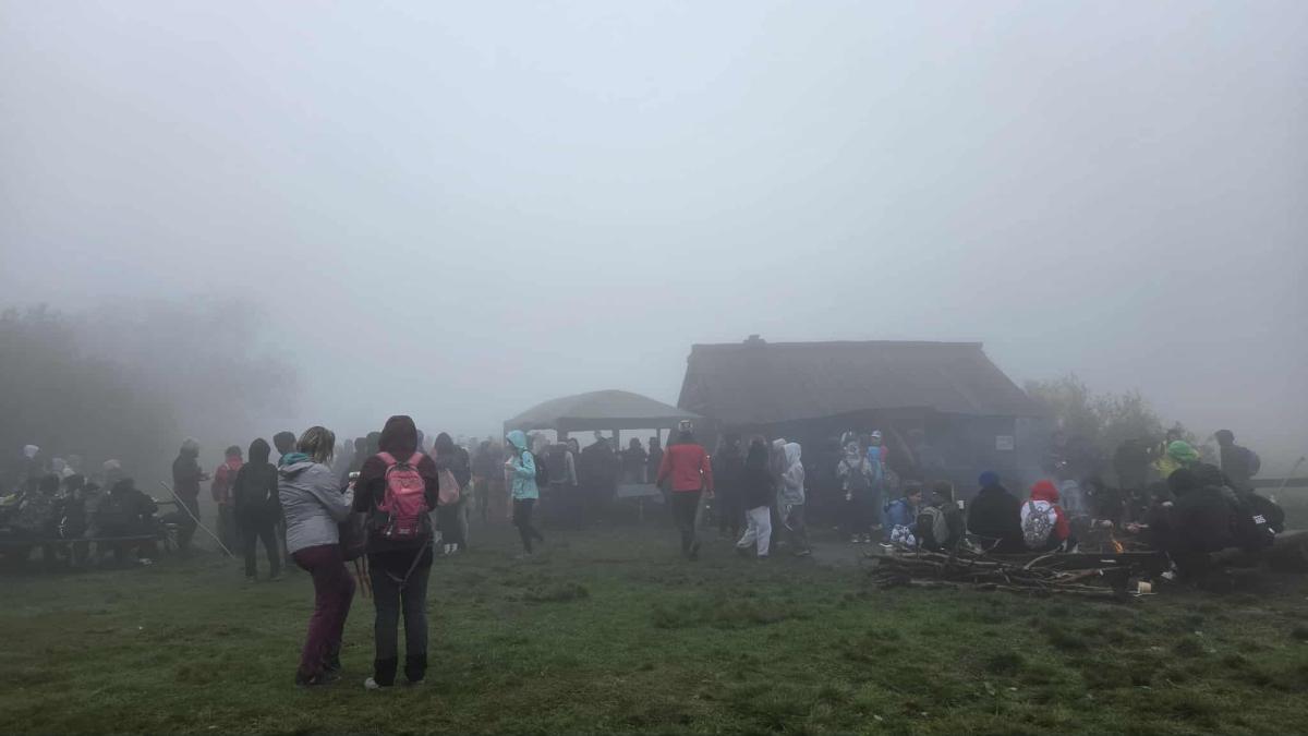 Nasi uczniowie nie przestraszyli się ani chłodu, ani mgły, ani wiatru. Dzielnie maszerowali, a na szczycie czekał na wszystkich poczęstunek przygotowany przez Koło Gospodyń Wiejskich Zielony Las w Grywałdzie.