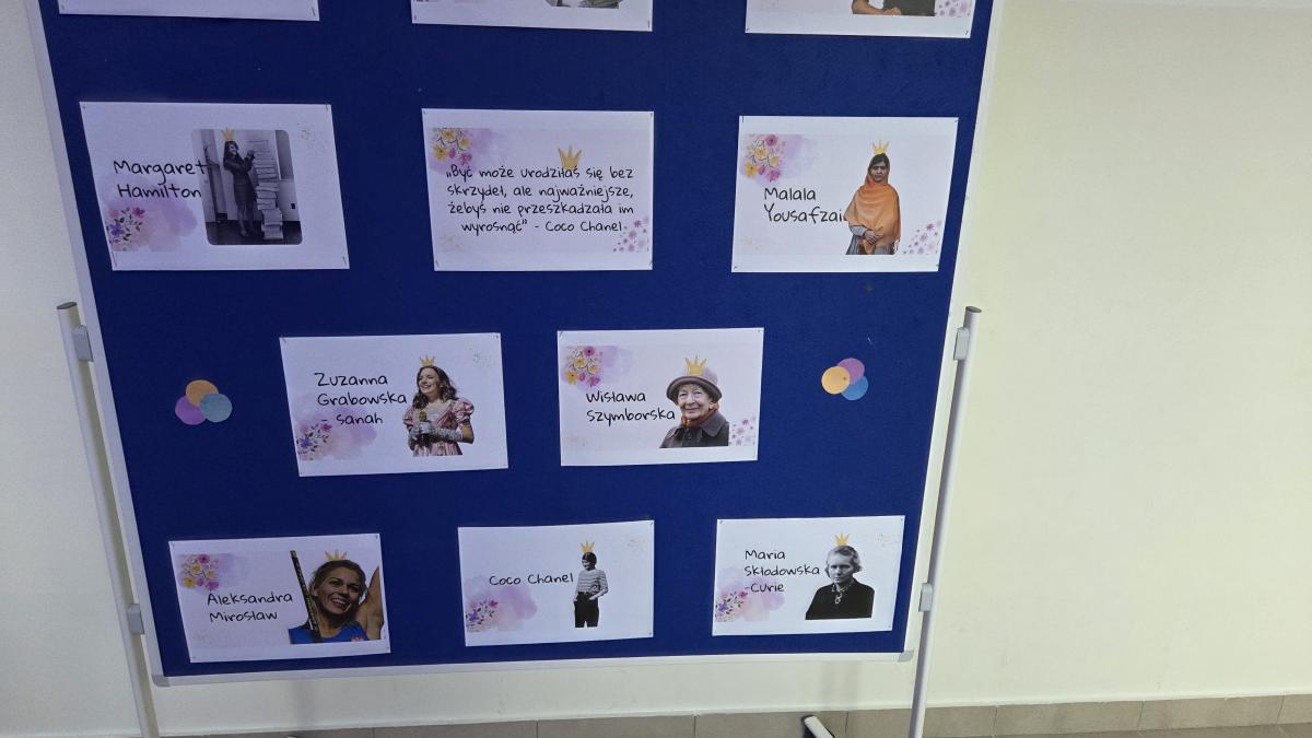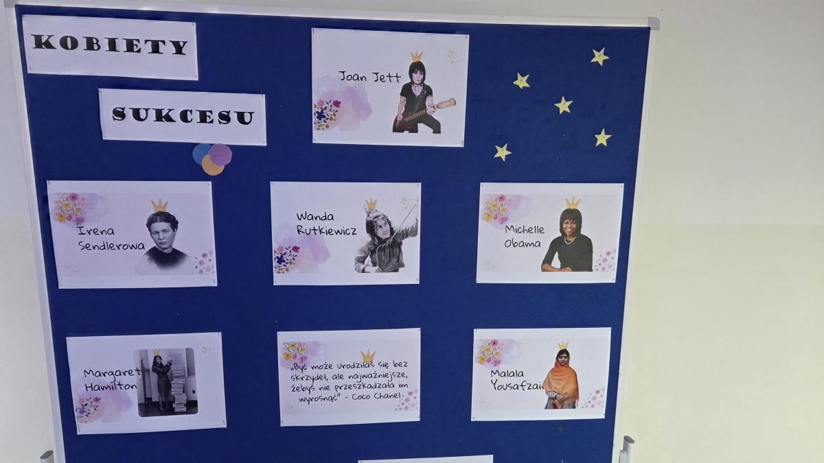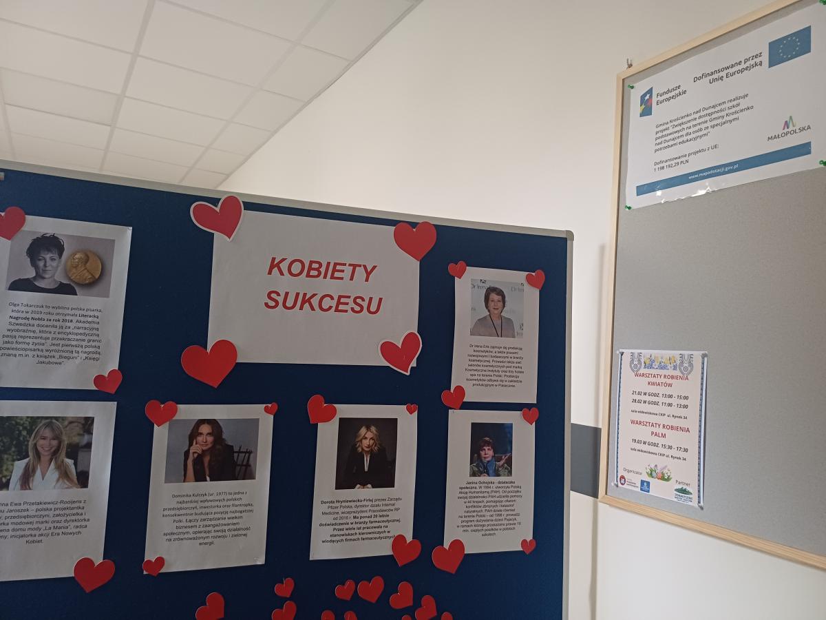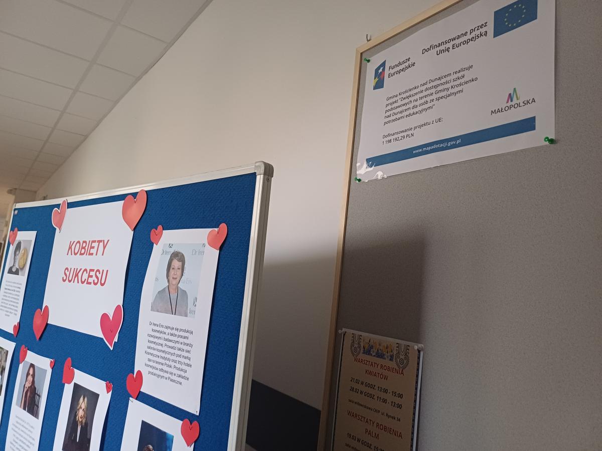 W szkole zostały wykonane gazetki, foldery oraz plakaty na temat kobiet sukcesu stanowiących wzór do naśladowania. Głównym motywem było promowanie roli kobiet w dziedzinie przedsiębiorczości i zarządzania, jak i propagowanie równości. Wykonanie prac miało na celu zainspirowanie uczennic naszej szkoły do podejmowania trudu nauki, pracy oraz takich działań, które w przyszłości również mogą przyczynić się do osiągnięcia sukcesu i zwiększenia ich poczucia wartości. Działania zostały zrealizowane w ramach projektu „Zwiększenie dostępności szkół podstawowych na terenie Gminy Krościenko nad Dunajcem dla osób ze specjalnymi potrzebami edukacyjnymi”, w ramach programu Fundusze dla Małopolski 2021-2027, Priorytet 5 Fundusze europejskie wspierające infrastrukturę społeczną, Działanie 5.1 Infrastruktura szkół podstawowych i ponadpodstawowych prowadzących kształcenie ogólne A. zwiększenie dostępności szkół podstawowych i ponadpodstawowych prowadzących kształcenie ogólne dla osób ze specjalnymi potrzebami edukacyjnymi, finansowanego ze środków Europejskiego Funduszu Rozwoju Regionalnego.