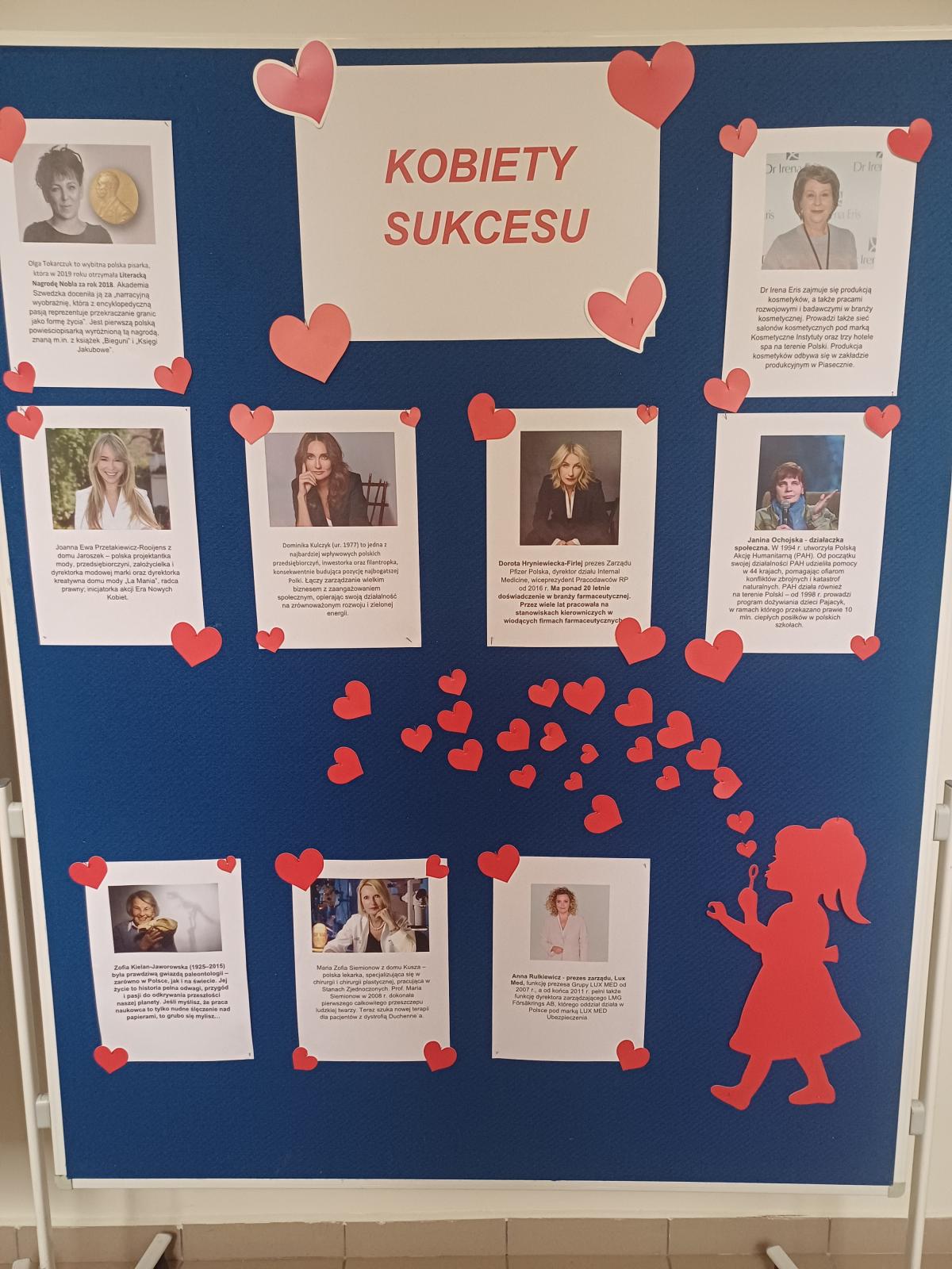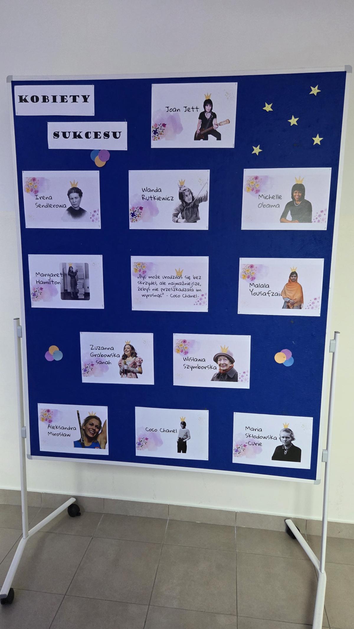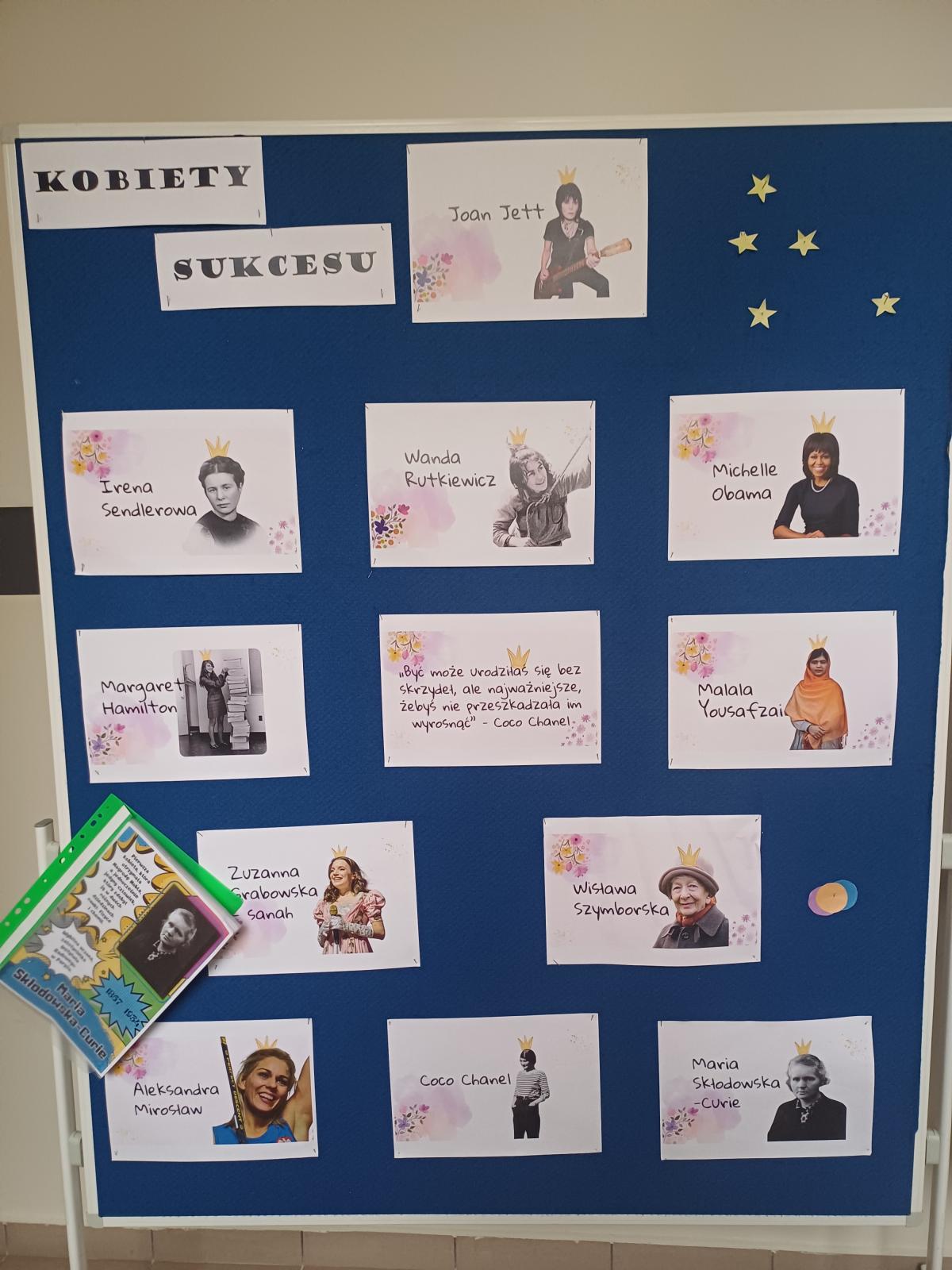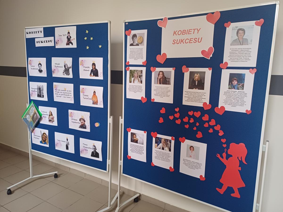 W szkole zostały wykonane gazetki, foldery oraz plakaty na temat kobiet sukcesu stanowiących wzór do naśladowania. Głównym motywem było promowanie roli kobiet w dziedzinie przedsiębiorczości i zarządzania, jak i propagowanie równości. Wykonanie prac miało na celu zainspirowanie uczennic naszej szkoły do podejmowania trudu nauki, pracy oraz takich działań, które w przyszłości również mogą przyczynić się do osiągnięcia sukcesu i zwiększenia ich poczucia wartości. Działania zostały zrealizowane w ramach projektu „Zwiększenie dostępności szkół podstawowych na terenie Gminy Krościenko nad Dunajcem dla osób ze specjalnymi potrzebami edukacyjnymi”, w ramach programu Fundusze dla Małopolski 2021-2027, Priorytet 5 Fundusze europejskie wspierające infrastrukturę społeczną, Działanie 5.1 Infrastruktura szkół podstawowych i ponadpodstawowych prowadzących kształcenie ogólne A. zwiększenie dostępności szkół podstawowych i ponadpodstawowych prowadzących kształcenie ogólne dla osób ze specjalnymi potrzebami edukacyjnymi, finansowanego ze środków Europejskiego Funduszu Rozwoju Regionalnego.