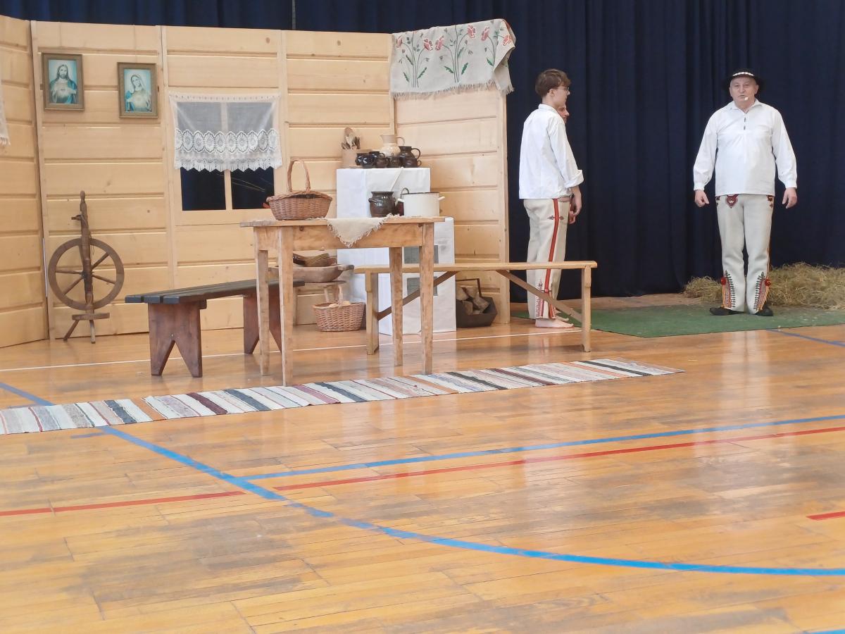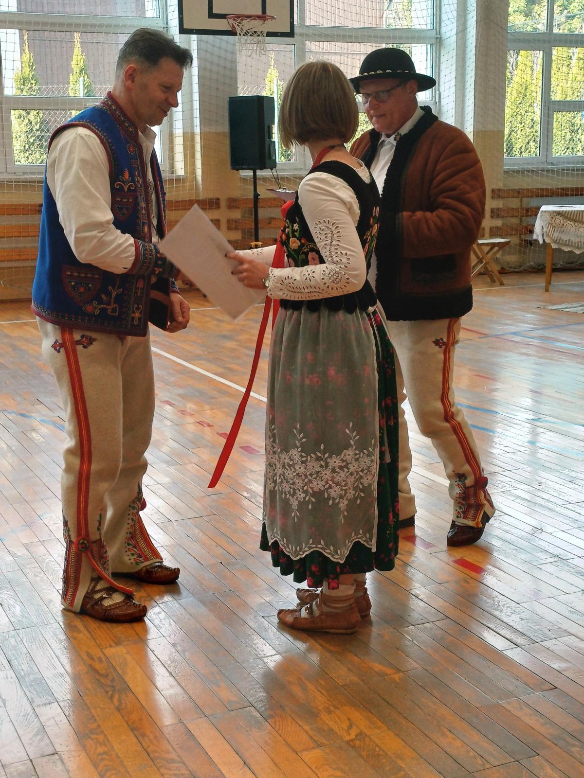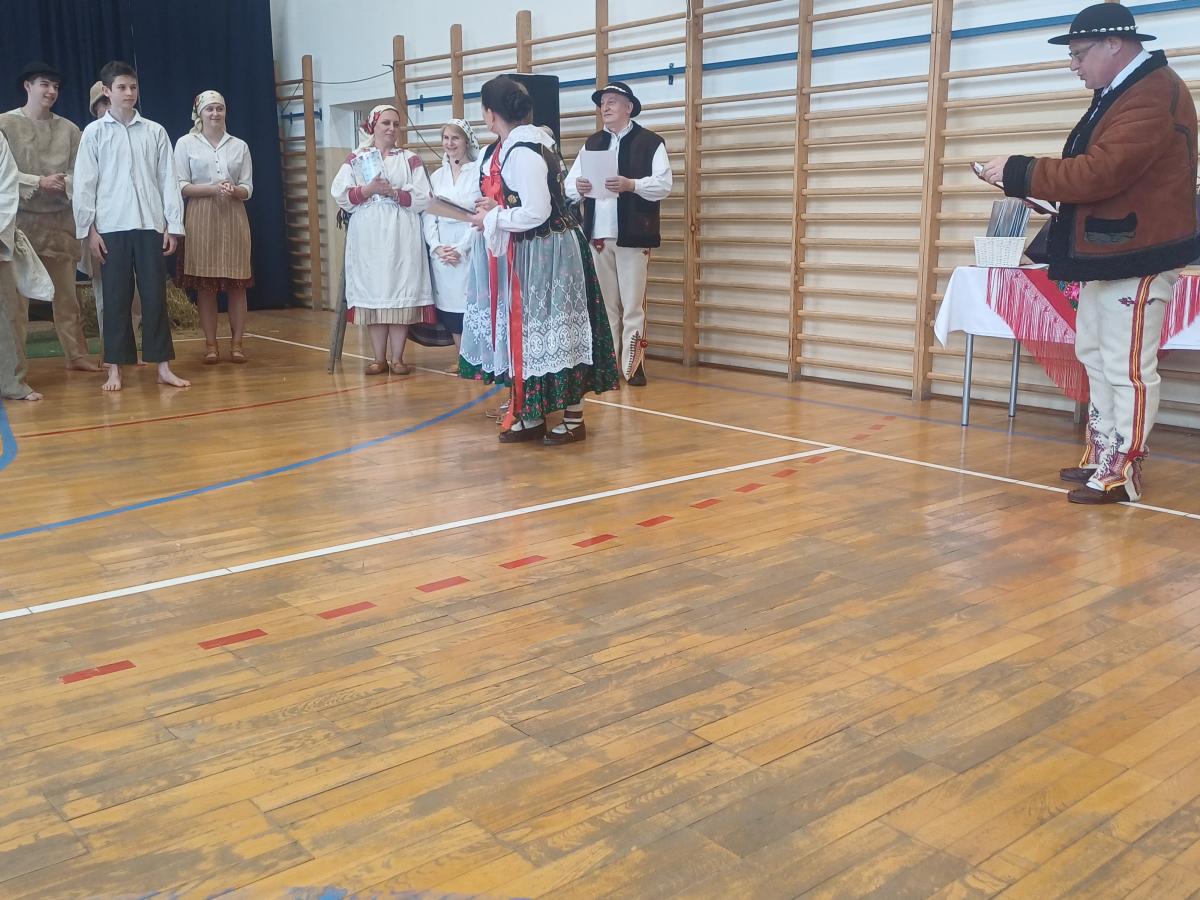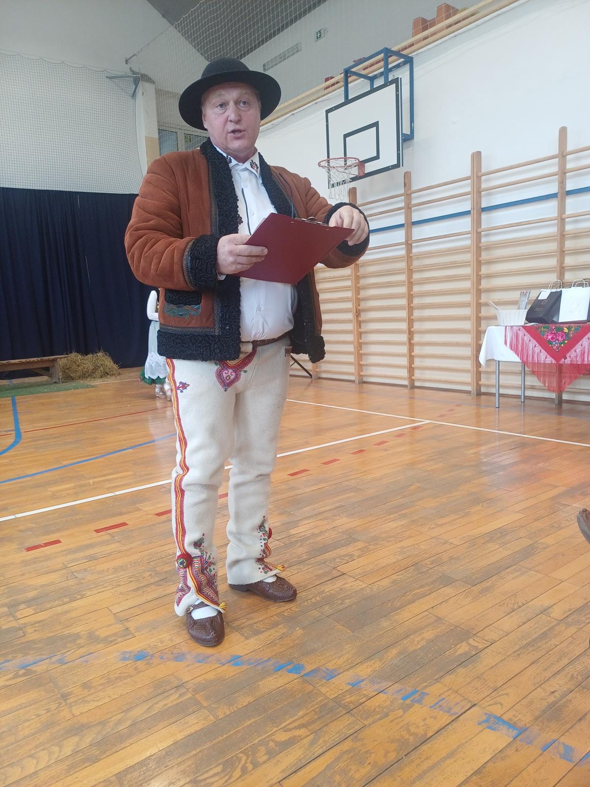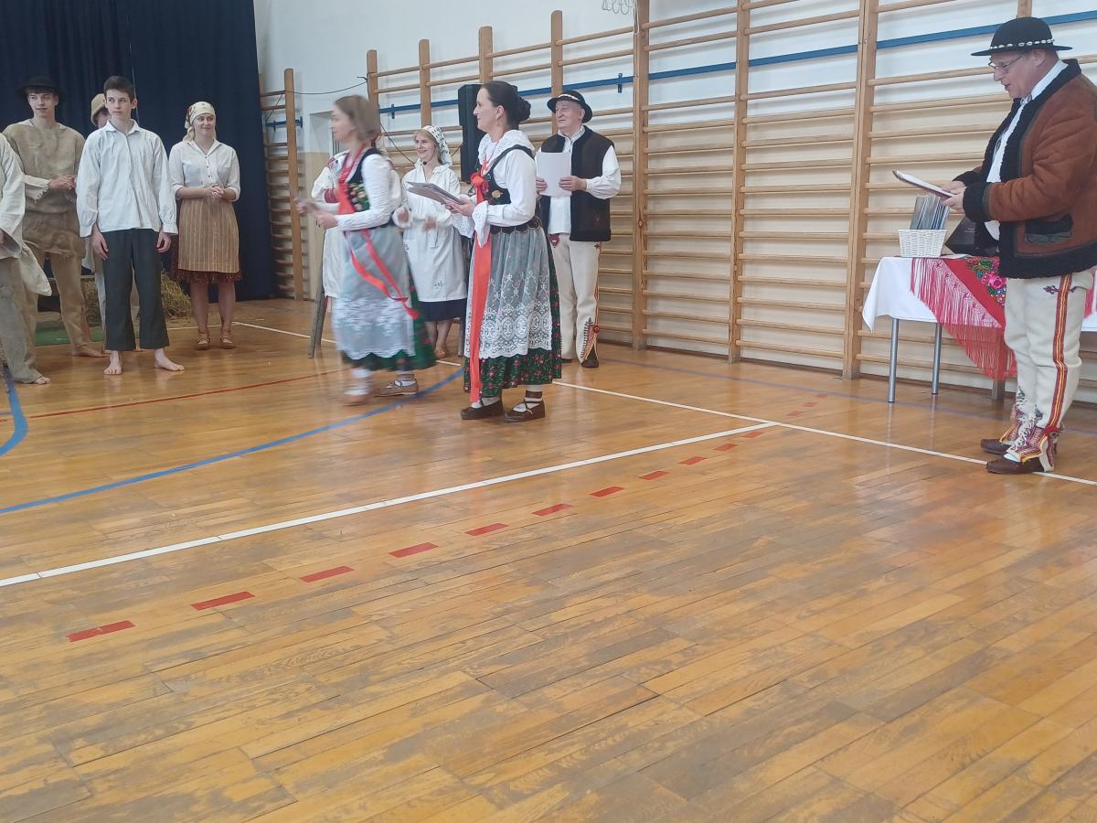 Etap wojewódzki konkursu rozpoczął się przedstawieniem „Bozy obiod”. W rolę aktorów wcielili się mieszkańcy Grywałdu, absolwenci oraz uczniowie naszej szkoły. Przybyłych trąbitą przywitał Jan Kubik. Dyrektor Szkoły Podstawowej w Grywałdzie, pan Władysław Bąk, zwrócił uwagę, że kultywowanie tradycji jest nie tylko obowiązkiem, ale przede wszystkim przywilejem i dumą. Życzył również sukcesów uczestnikom biorącym udział w Konkursie. Głos zabrał także Wójt Gminy Krościenko nad Dunajcem – pan Stanisław Tkaczyk.