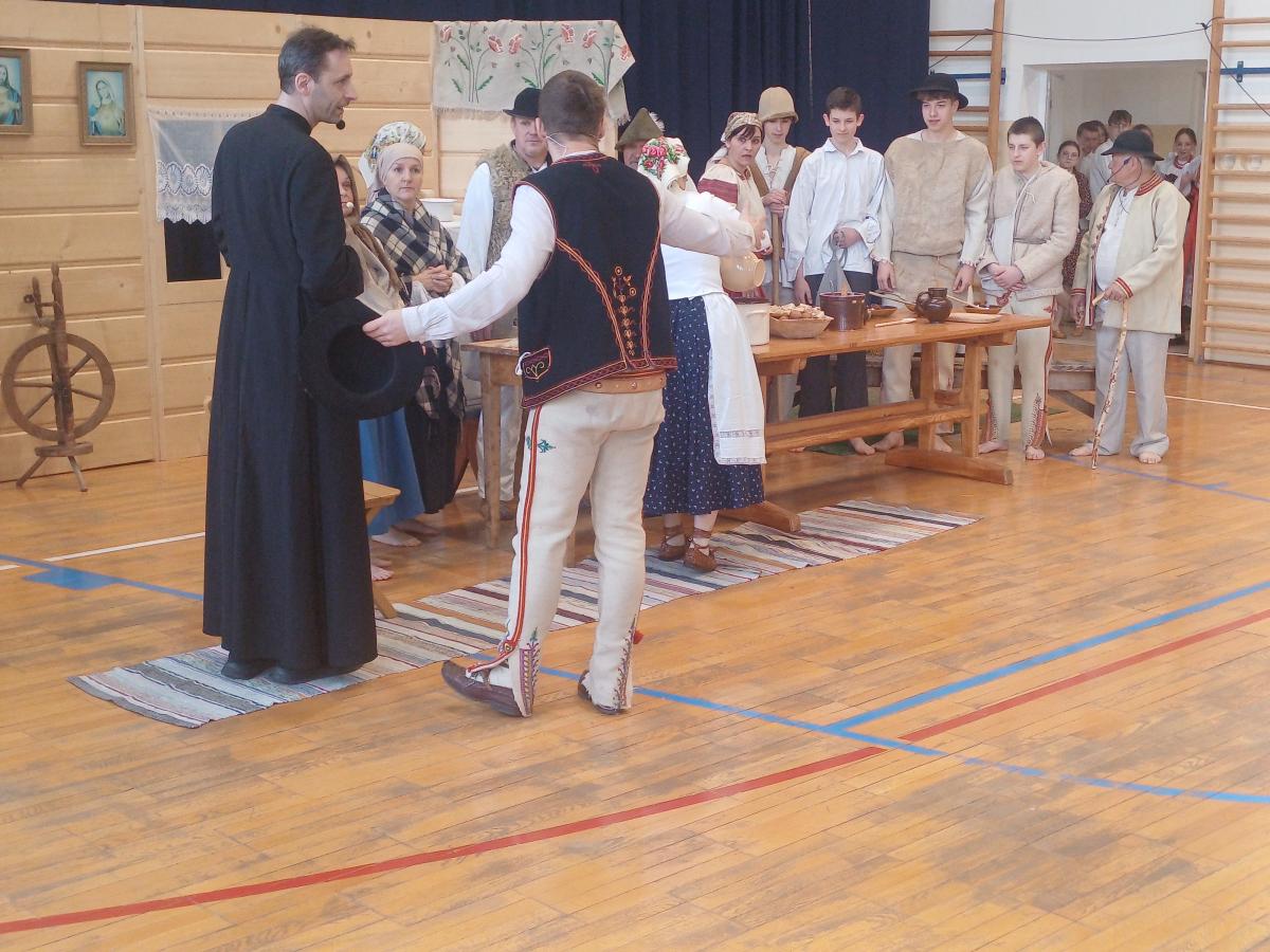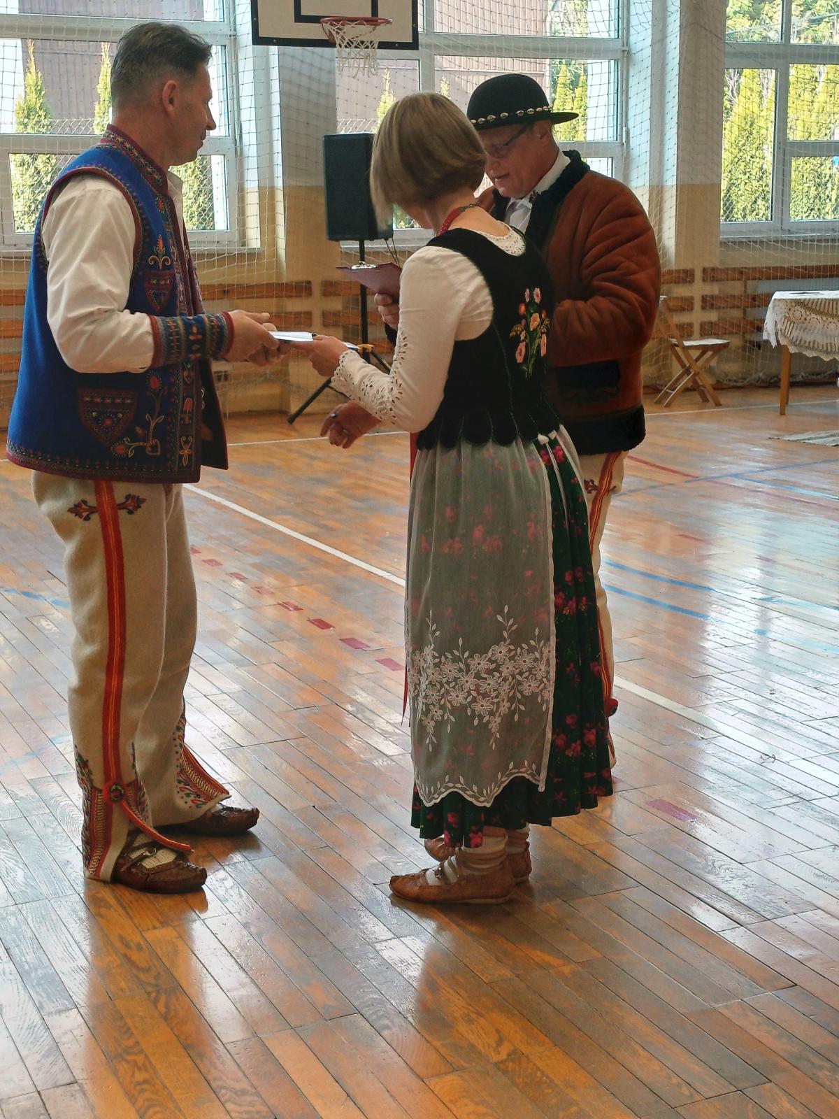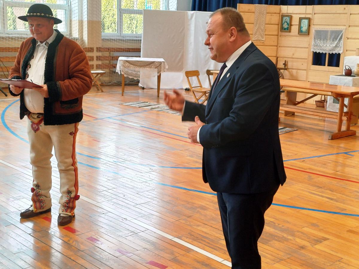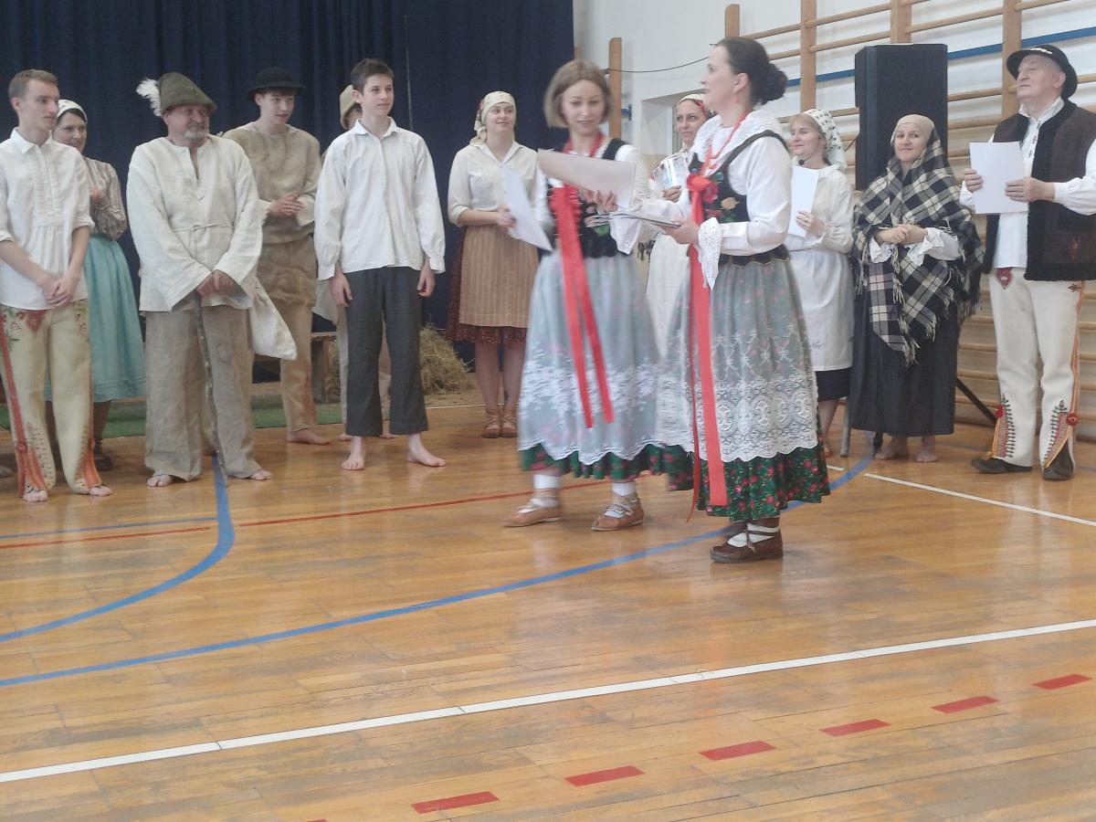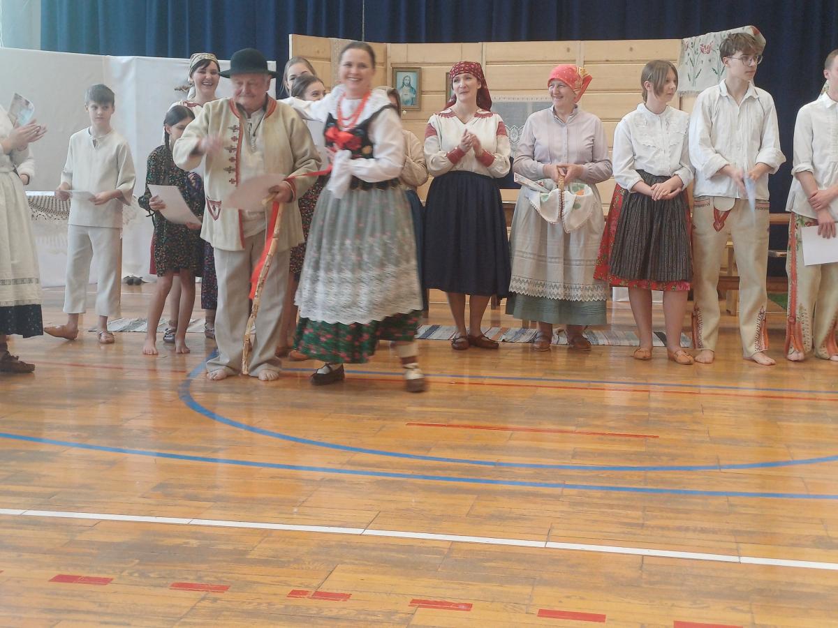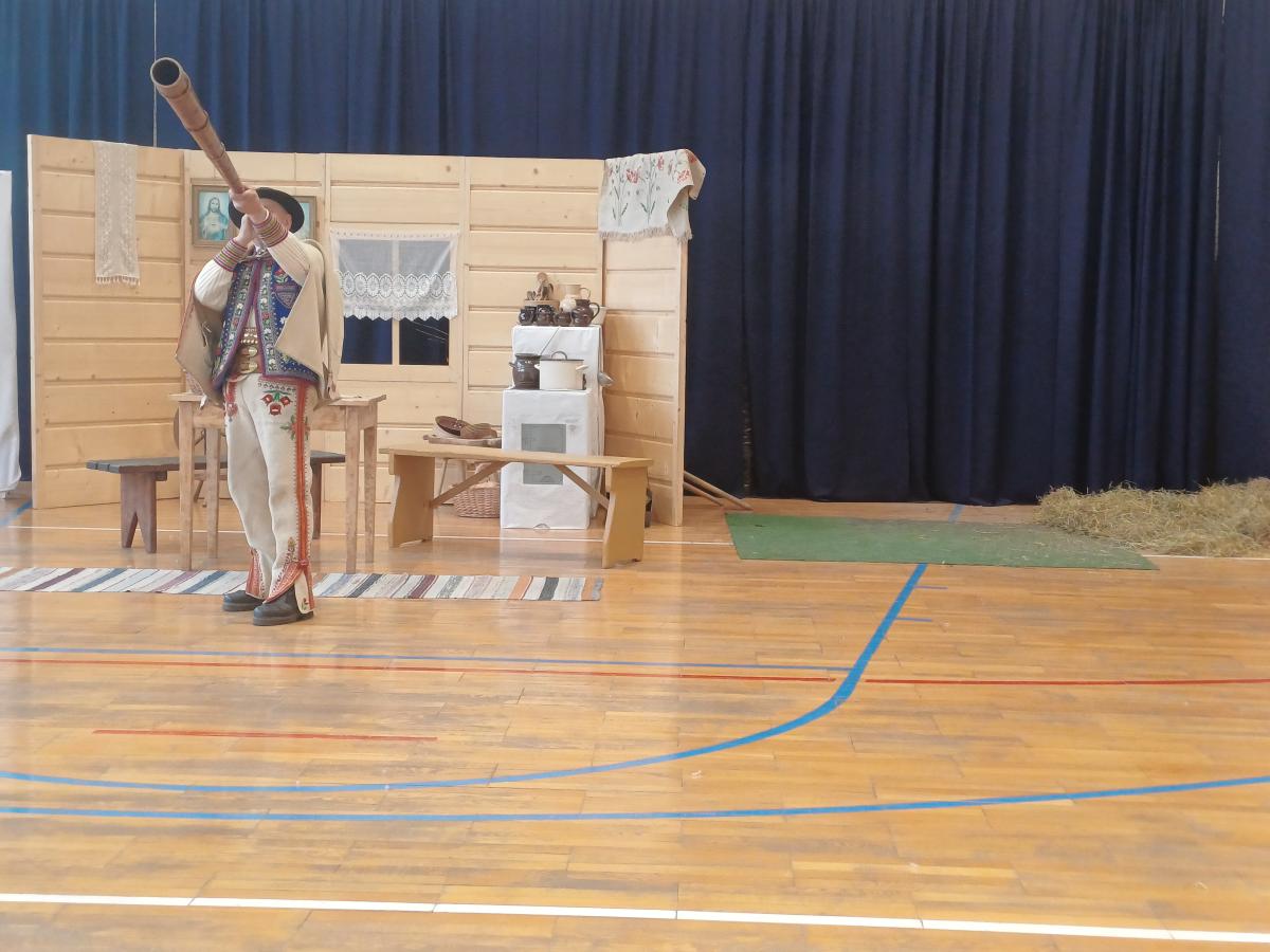 Etap wojewódzki konkursu rozpoczął się przedstawieniem „Bozy obiod”. W rolę aktorów wcielili się mieszkańcy Grywałdu, absolwenci oraz uczniowie naszej szkoły. Przybyłych trąbitą przywitał Jan Kubik. Dyrektor Szkoły Podstawowej w Grywałdzie, pan Władysław Bąk, zwrócił uwagę, że kultywowanie tradycji jest nie tylko obowiązkiem, ale przede wszystkim przywilejem i dumą. Życzył również sukcesów uczestnikom biorącym udział w Konkursie. Głos zabrał także Wójt Gminy Krościenko nad Dunajcem – pan Stanisław Tkaczyk.