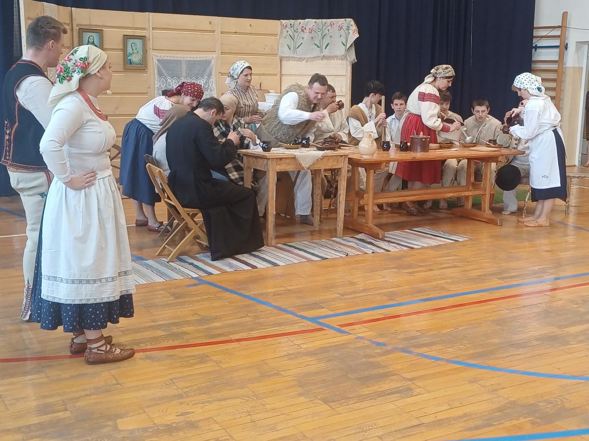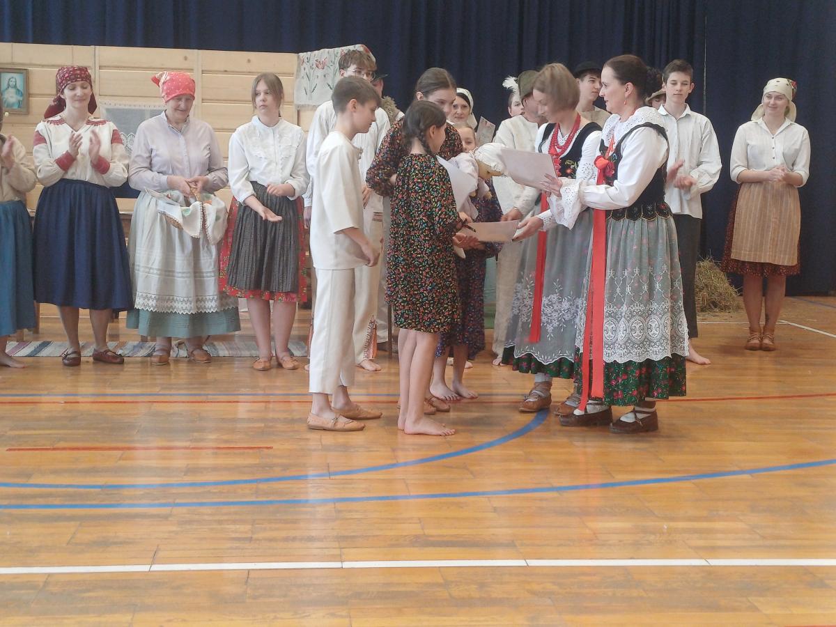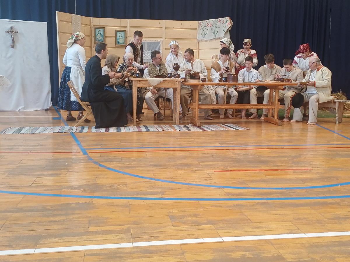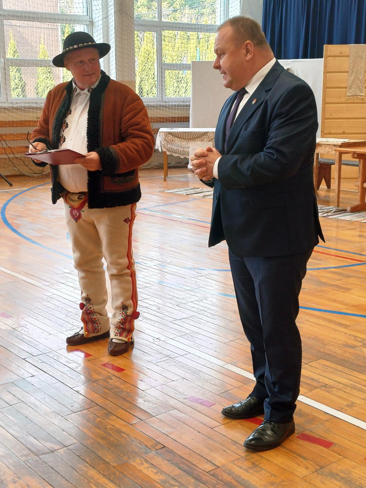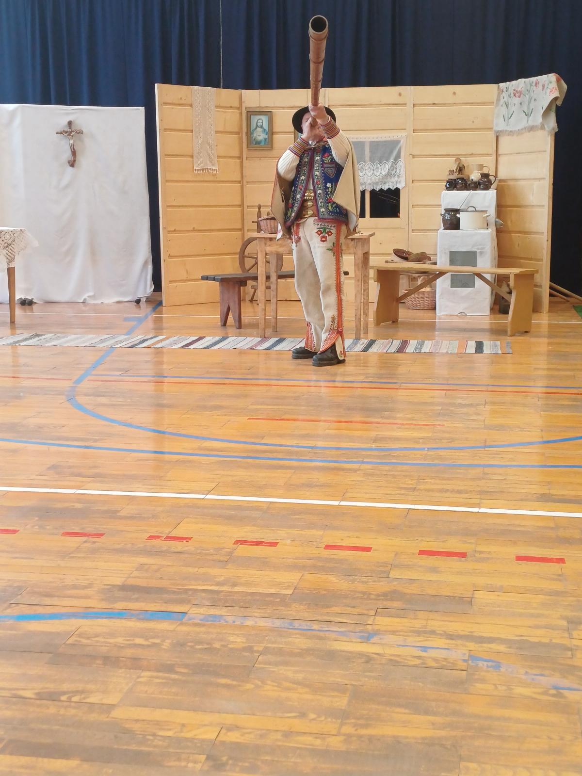 Etap wojewódzki konkursu rozpoczął się przedstawieniem „Bozy obiod”. W rolę aktorów wcielili się mieszkańcy Grywałdu, absolwenci oraz uczniowie naszej szkoły. Przybyłych trąbitą przywitał Jan Kubik. Dyrektor Szkoły Podstawowej w Grywałdzie, pan Władysław Bąk, zwrócił uwagę, że kultywowanie tradycji jest nie tylko obowiązkiem, ale przede wszystkim przywilejem i dumą. Życzył również sukcesów uczestnikom biorącym udział w Konkursie. Głos zabrał także Wójt Gminy Krościenko nad Dunajcem – pan Stanisław Tkaczyk.