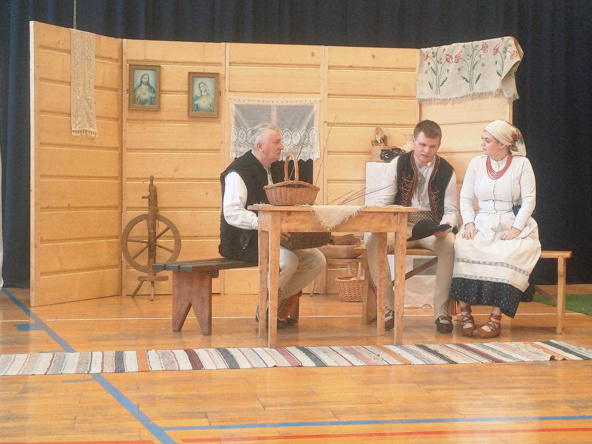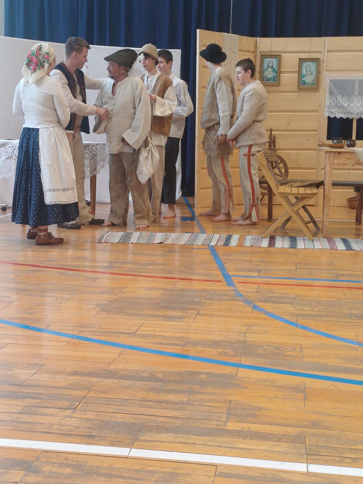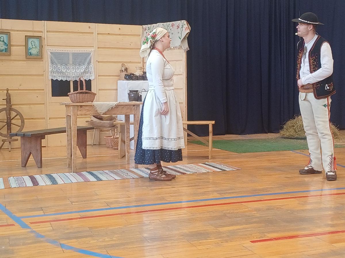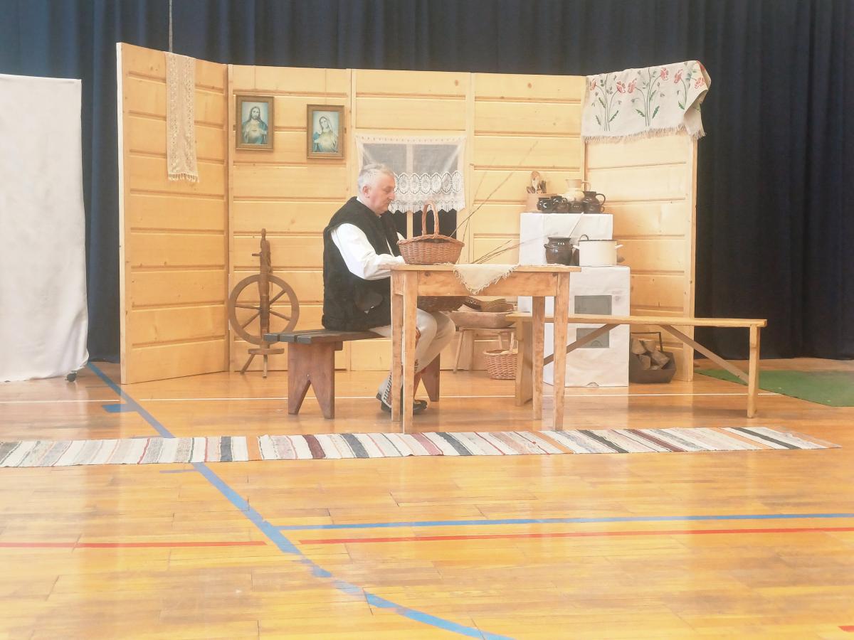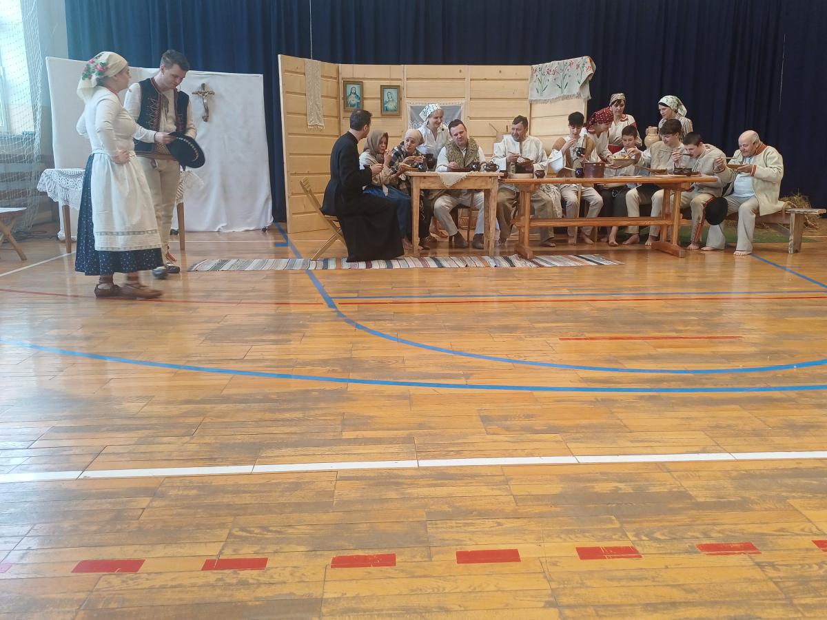Etap wojewódzki konkursu rozpoczął się przedstawieniem „Bozy obiod”. W rolę aktorów wcielili się mieszkańcy Grywałdu, absolwenci oraz uczniowie naszej szkoły. Przybyłych trąbitą przywitał Jan Kubik. Dyrektor Szkoły Podstawowej w Grywałdzie, pan Władysław Bąk, zwrócił uwagę, że kultywowanie tradycji jest nie tylko obowiązkiem, ale przede wszystkim przywilejem i dumą. Życzył również sukcesów uczestnikom biorącym udział w Konkursie. Głos zabrał także Wójt Gminy Krościenko nad Dunajcem – pan Stanisław Tkaczyk.