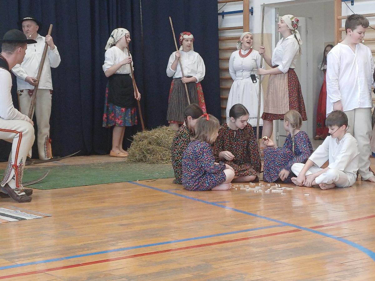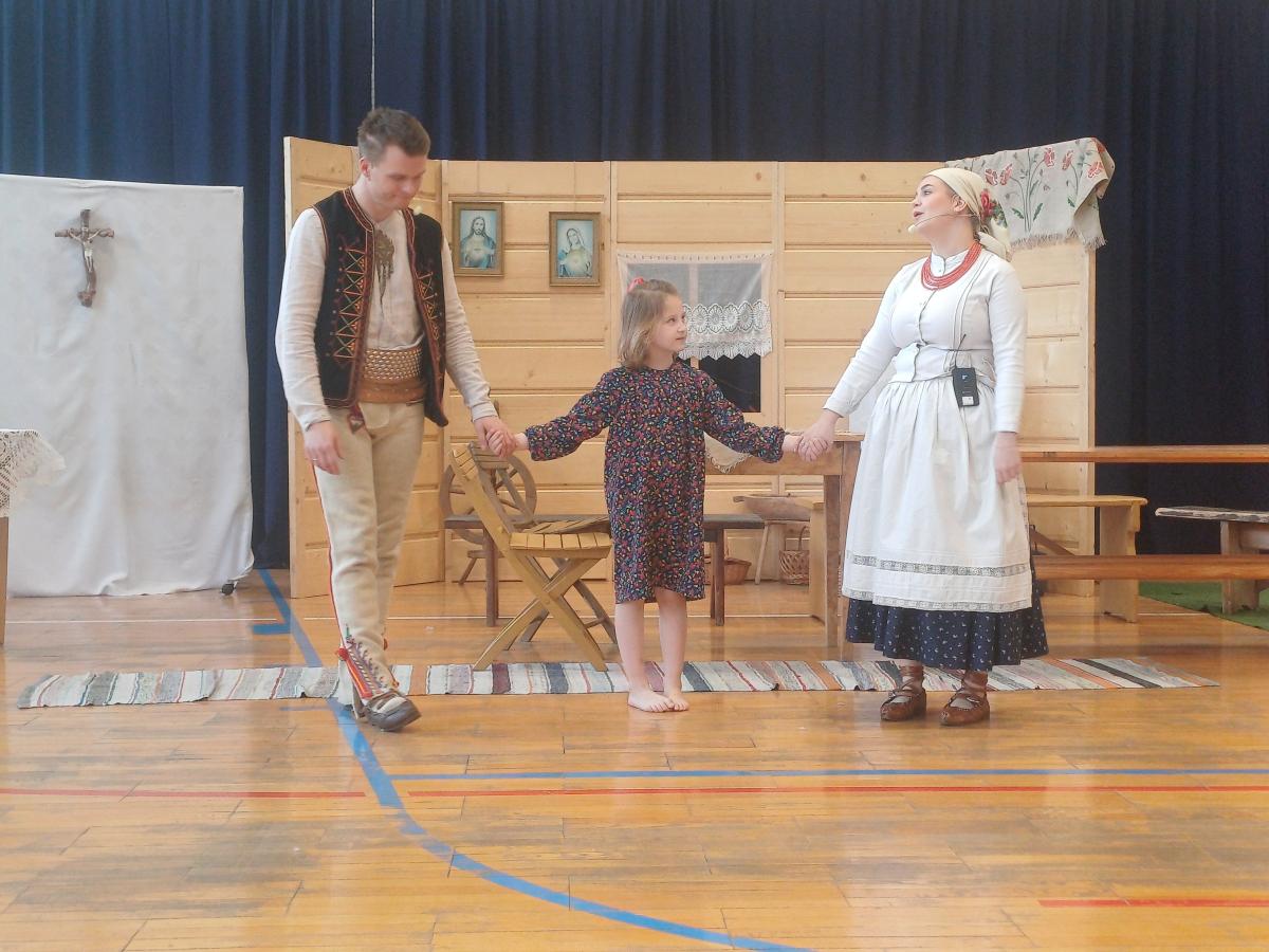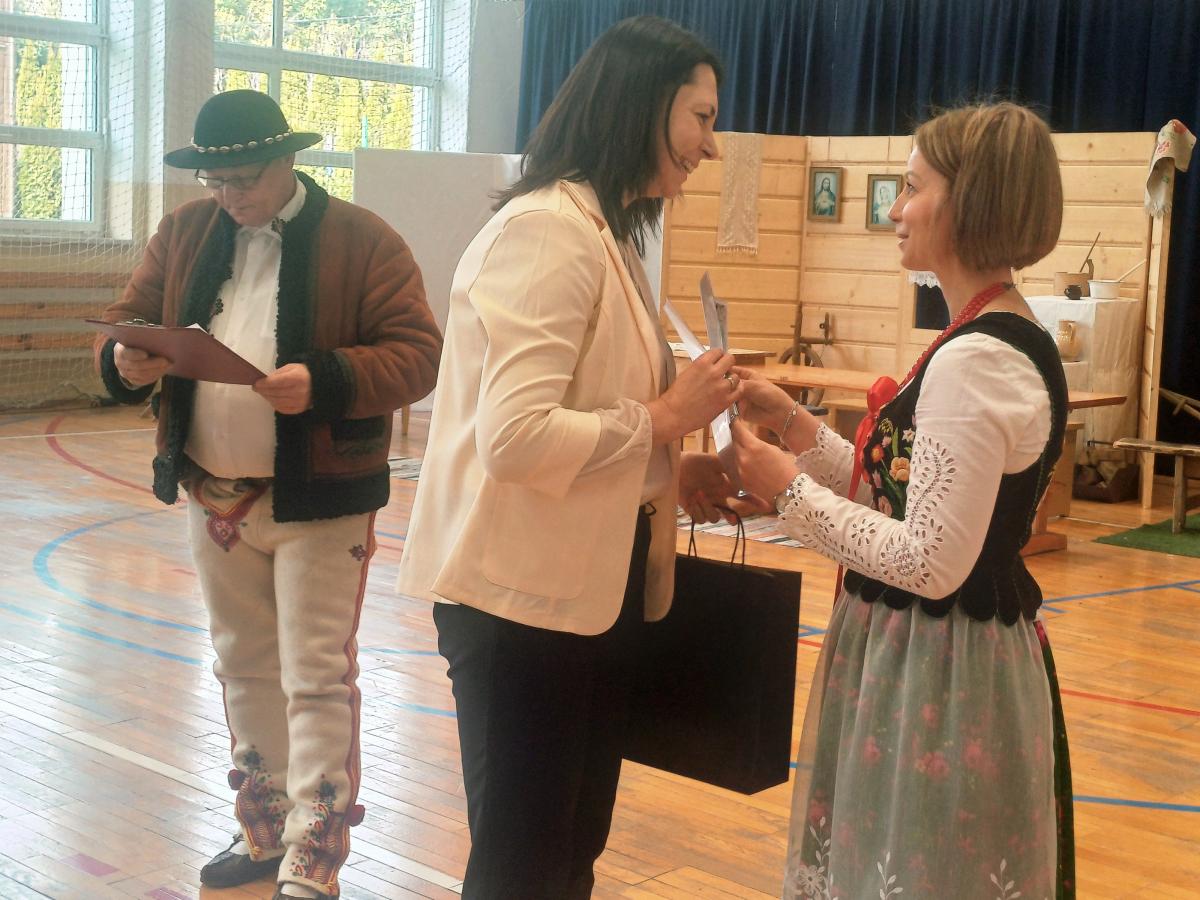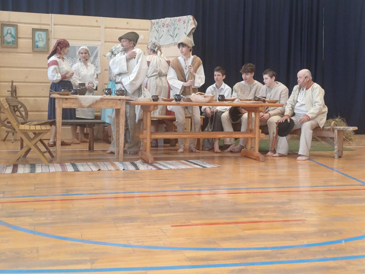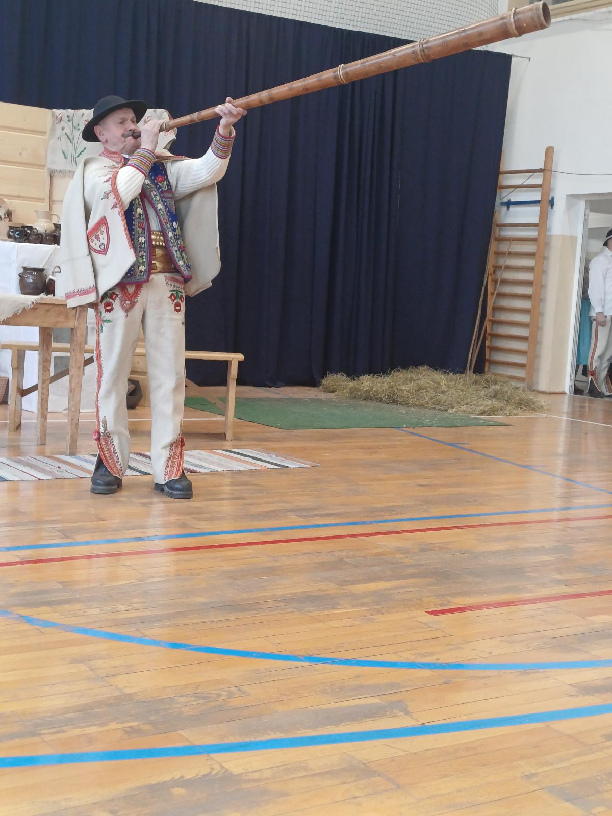 Etap wojewódzki konkursu rozpoczął się przedstawieniem „Bozy obiod”. W rolę aktorów wcielili się mieszkańcy Grywałdu, absolwenci oraz uczniowie naszej szkoły. Przybyłych trąbitą przywitał Jan Kubik. Dyrektor Szkoły Podstawowej w Grywałdzie, pan Władysław Bąk, zwrócił uwagę, że kultywowanie tradycji jest nie tylko obowiązkiem, ale przede wszystkim przywilejem i dumą. Życzył również sukcesów uczestnikom biorącym udział w Konkursie. Głos zabrał także Wójt Gminy Krościenko nad Dunajcem – pan Stanisław Tkaczyk.