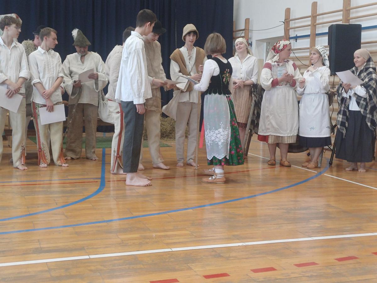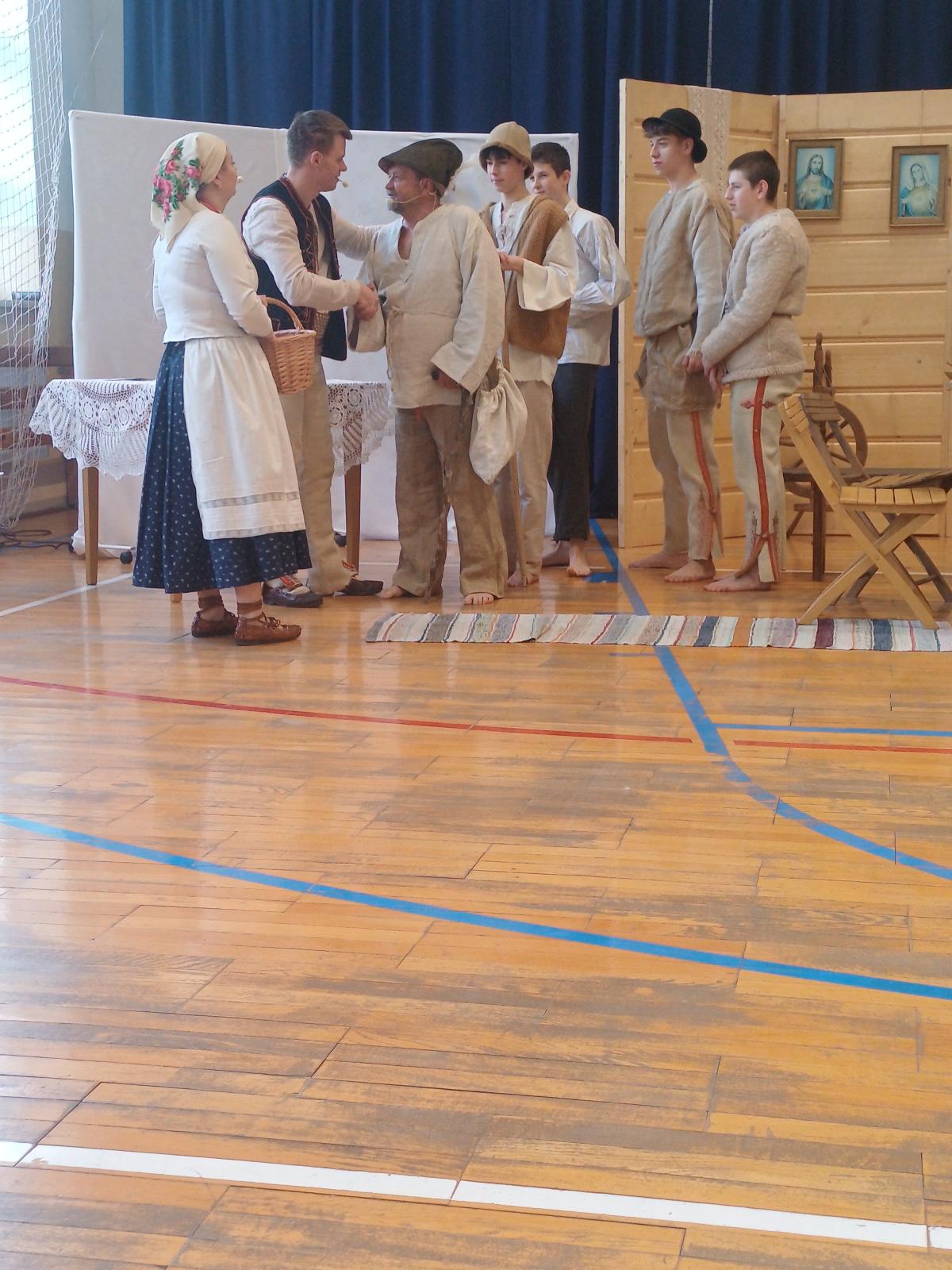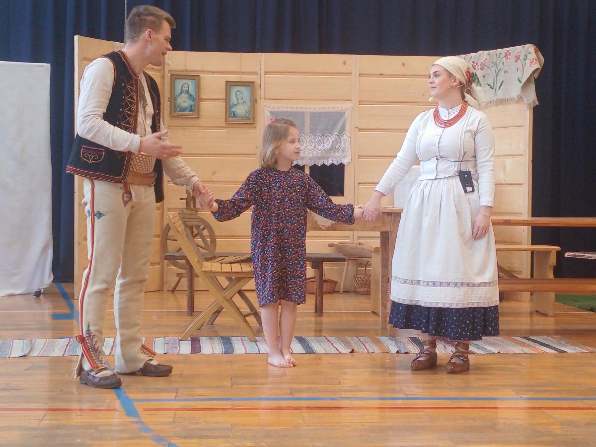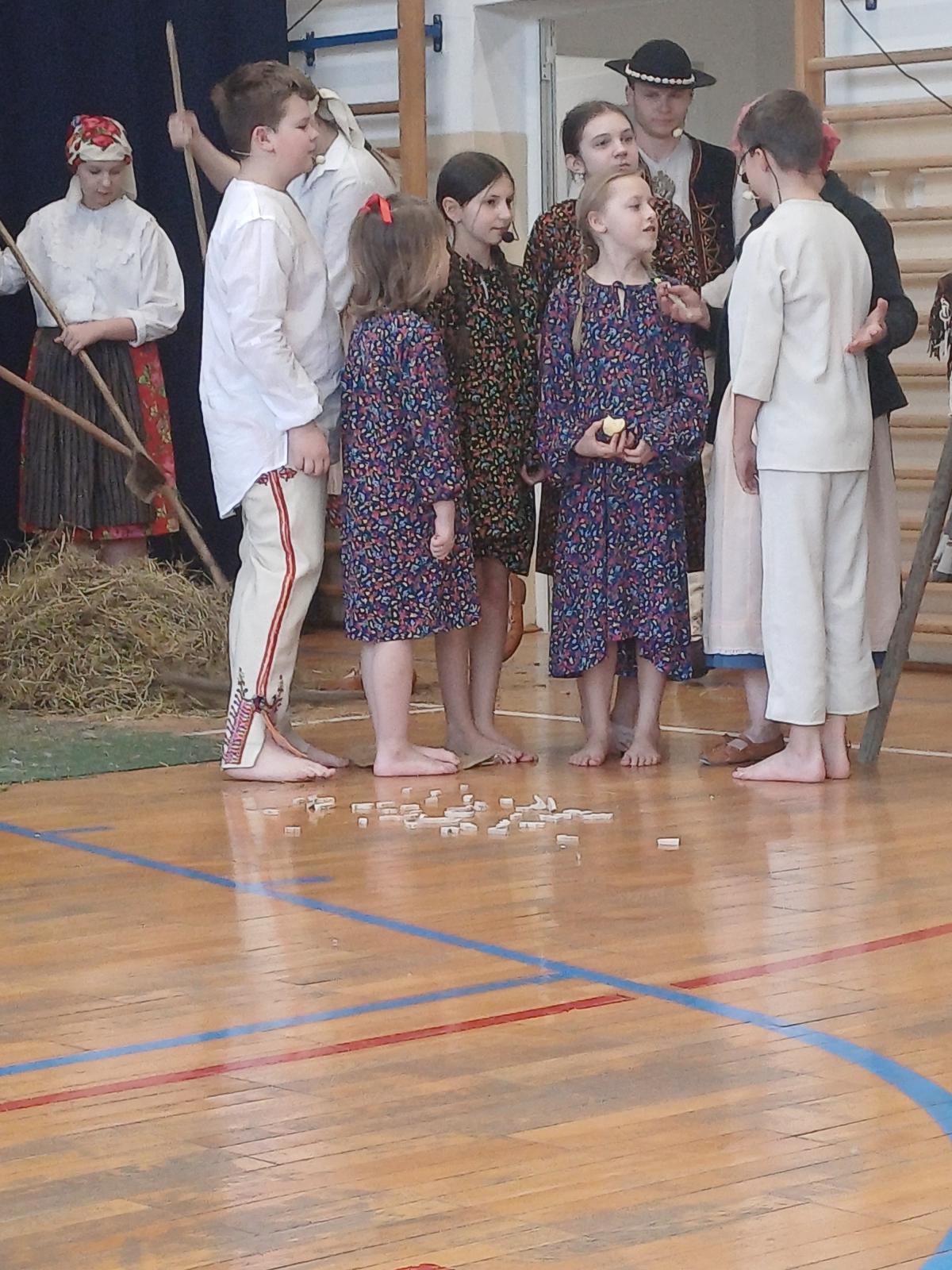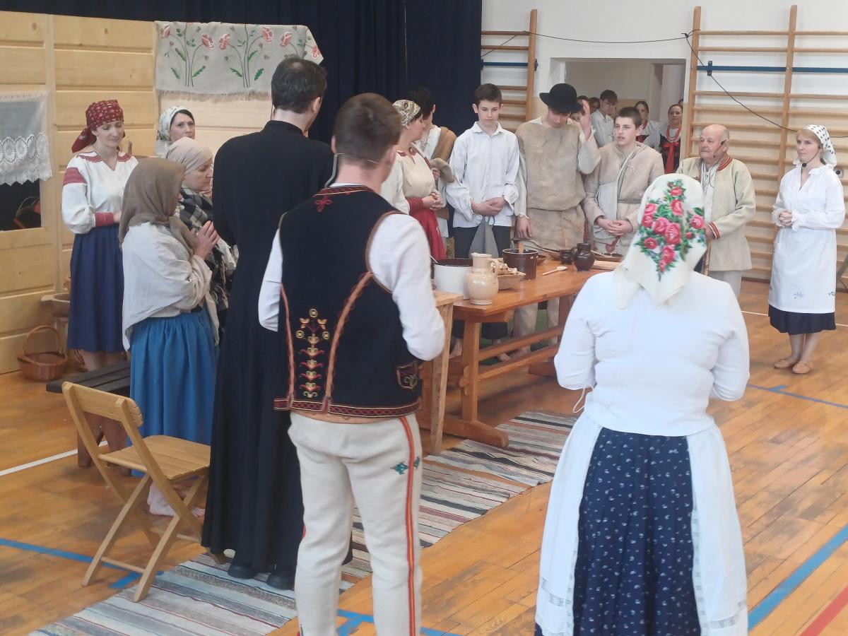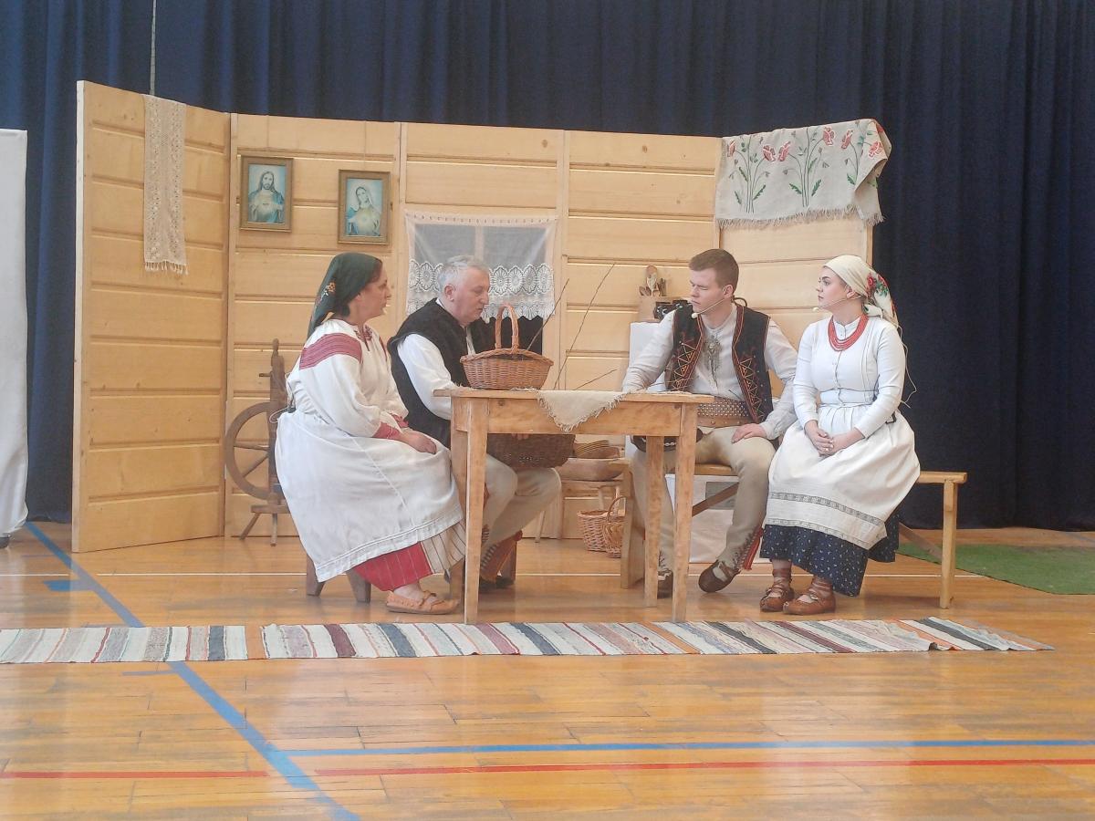 Etap wojewódzki konkursu rozpoczął się przedstawieniem „Bozy obiod”. W rolę aktorów wcielili się mieszkańcy Grywałdu, absolwenci oraz uczniowie naszej szkoły. Przybyłych trąbitą przywitał Jan Kubik. Dyrektor Szkoły Podstawowej w Grywałdzie, pan Władysław Bąk, zwrócił uwagę, że kultywowanie tradycji jest nie tylko obowiązkiem, ale przede wszystkim przywilejem i dumą. Życzył również sukcesów uczestnikom biorącym udział w Konkursie. Głos zabrał także Wójt Gminy Krościenko nad Dunajcem – pan Stanisław Tkaczyk.