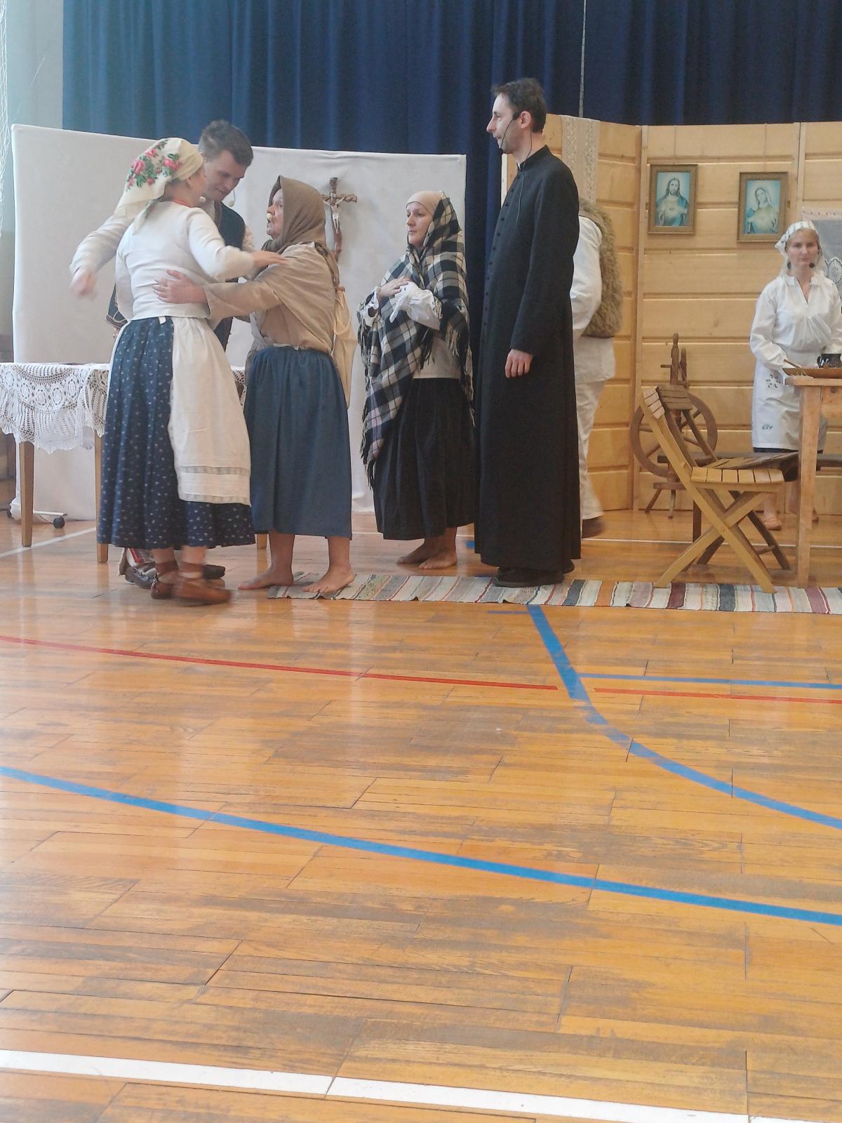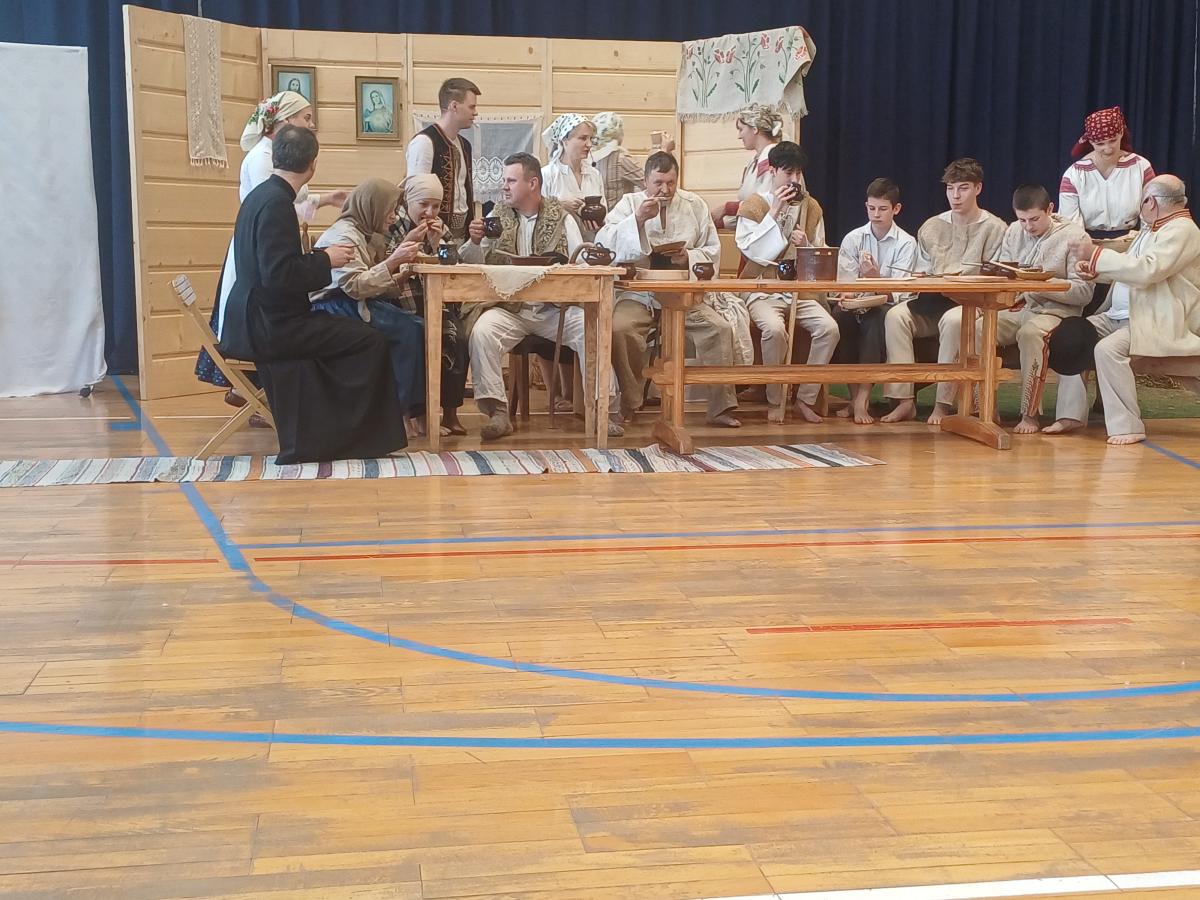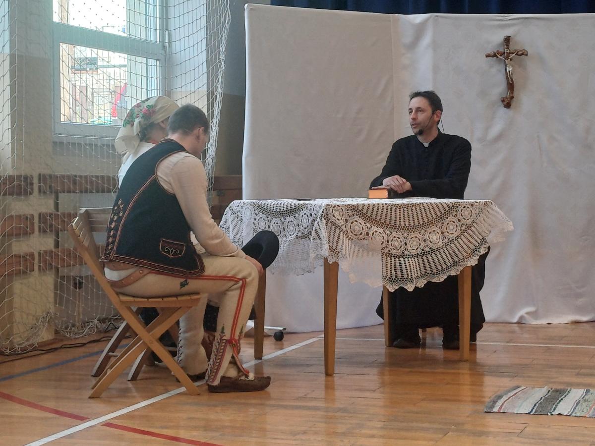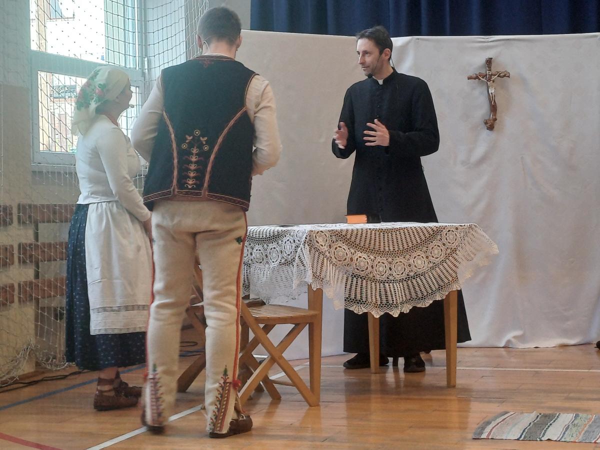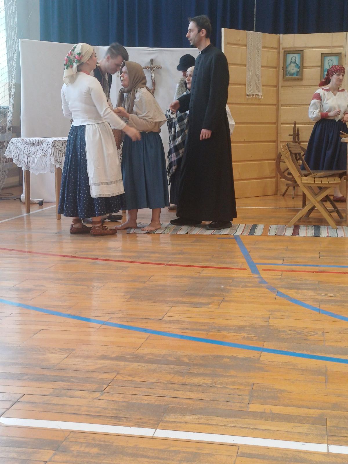 Etap wojewódzki konkursu rozpoczął się przedstawieniem „Bozy obiod”. W rolę aktorów wcielili się mieszkańcy Grywałdu, absolwenci oraz uczniowie naszej szkoły. Przybyłych trąbitą przywitał Jan Kubik. Dyrektor Szkoły Podstawowej w Grywałdzie, pan Władysław Bąk, zwrócił uwagę, że kultywowanie tradycji jest nie tylko obowiązkiem, ale przede wszystkim przywilejem i dumą. Życzył również sukcesów uczestnikom biorącym udział w Konkursie. Głos zabrał także Wójt Gminy Krościenko nad Dunajcem – pan Stanisław Tkaczyk.