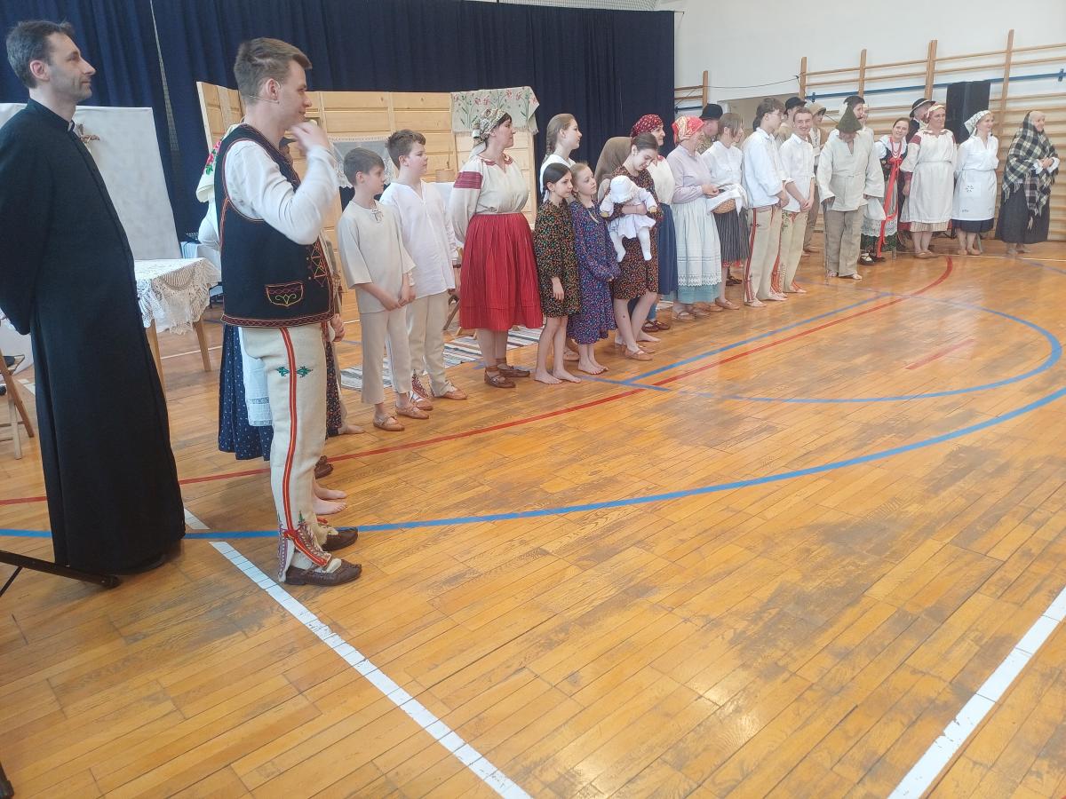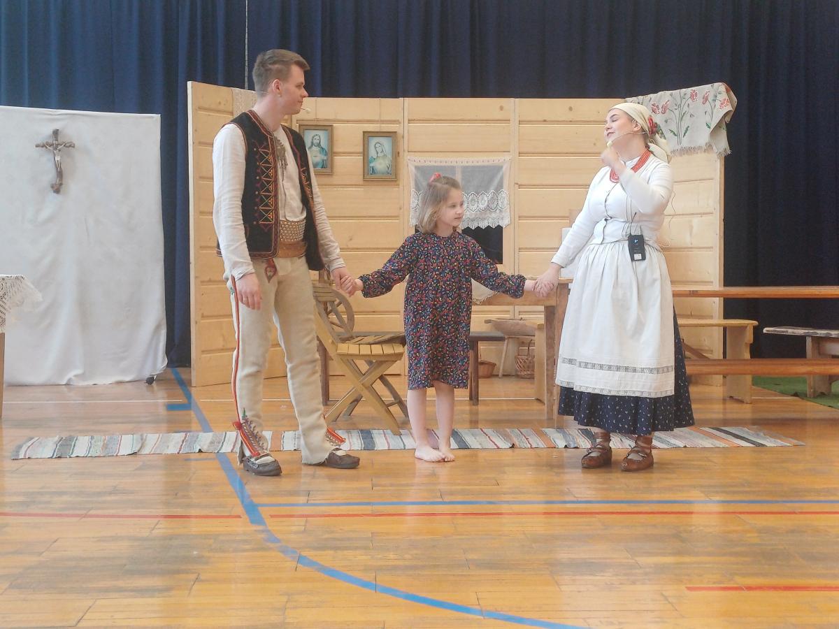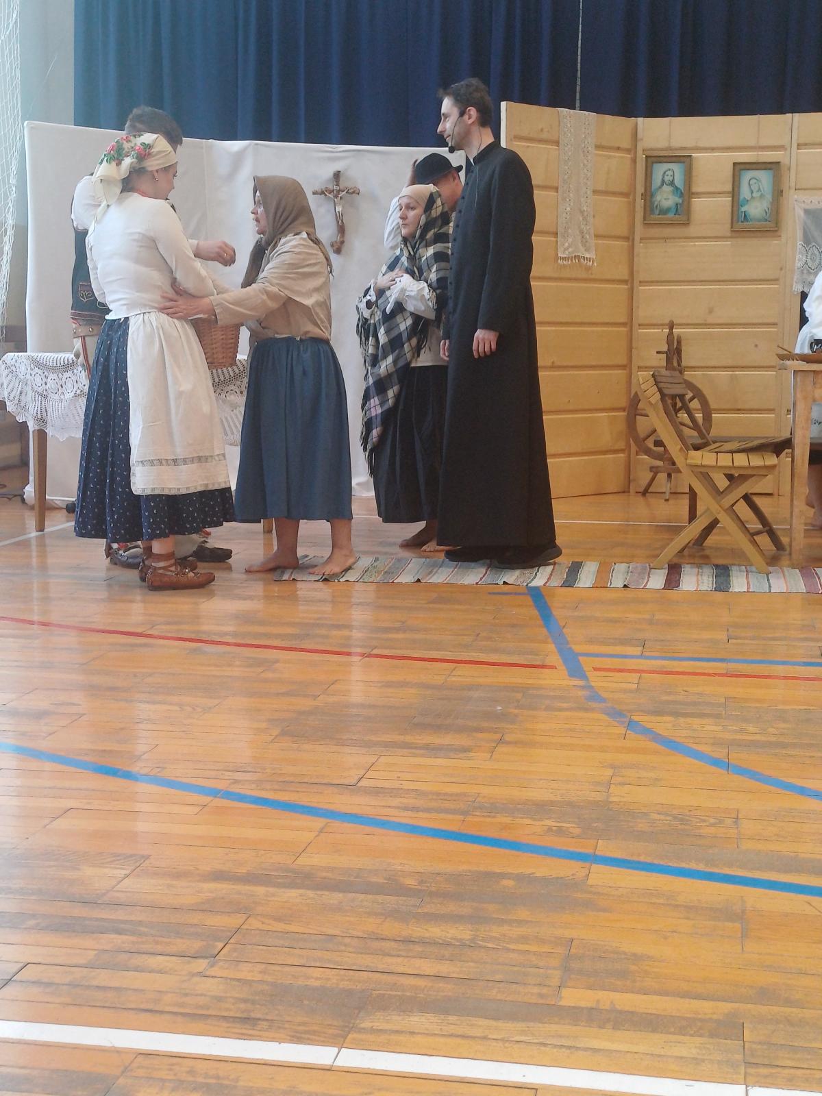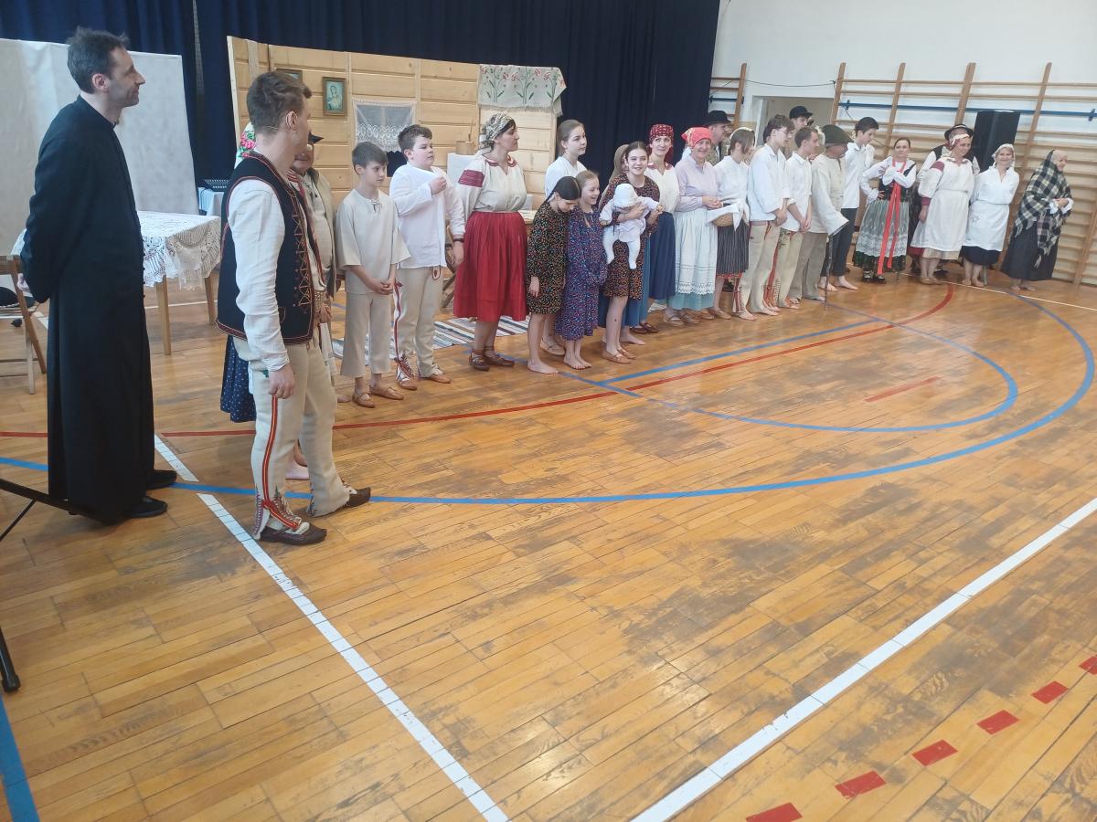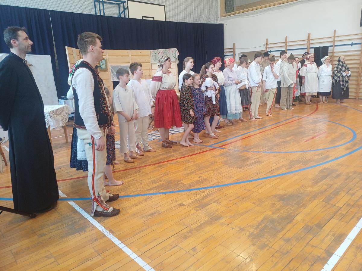 Etap wojewódzki konkursu rozpoczął się przedstawieniem „Bozy obiod”. W rolę aktorów wcielili się mieszkańcy Grywałdu, absolwenci oraz uczniowie naszej szkoły. Przybyłych trąbitą przywitał Jan Kubik. Dyrektor Szkoły Podstawowej w Grywałdzie, pan Władysław Bąk, zwrócił uwagę, że kultywowanie tradycji jest nie tylko obowiązkiem, ale przede wszystkim przywilejem i dumą. Życzył również sukcesów uczestnikom biorącym udział w Konkursie. Głos zabrał także Wójt Gminy Krościenko nad Dunajcem – pan Stanisław Tkaczyk.