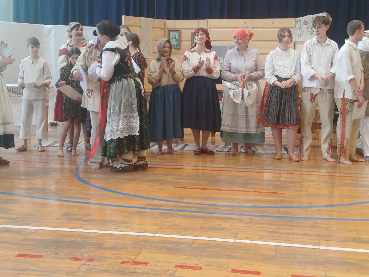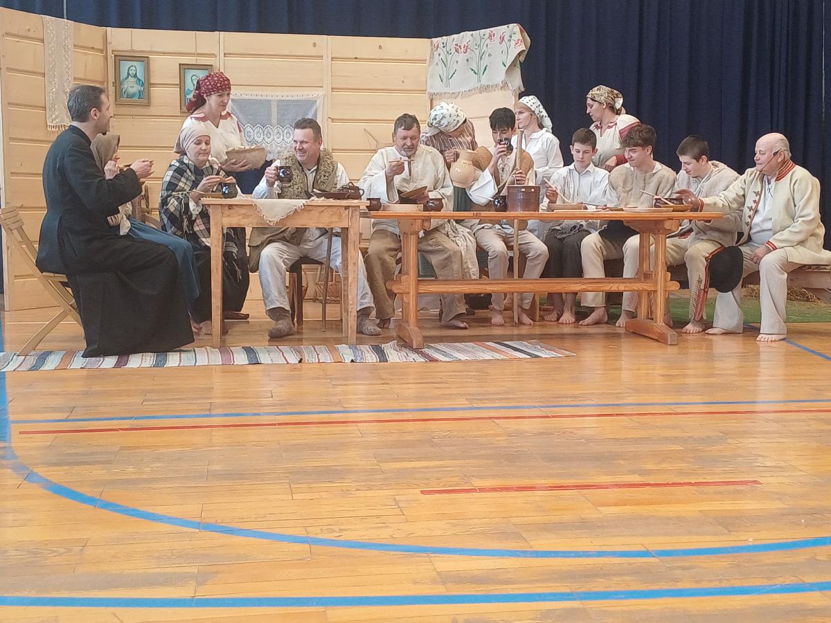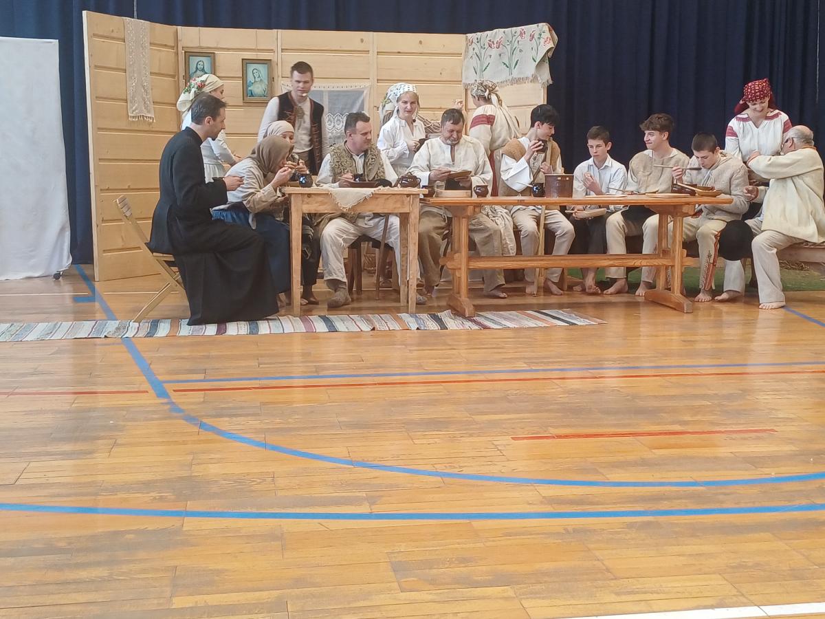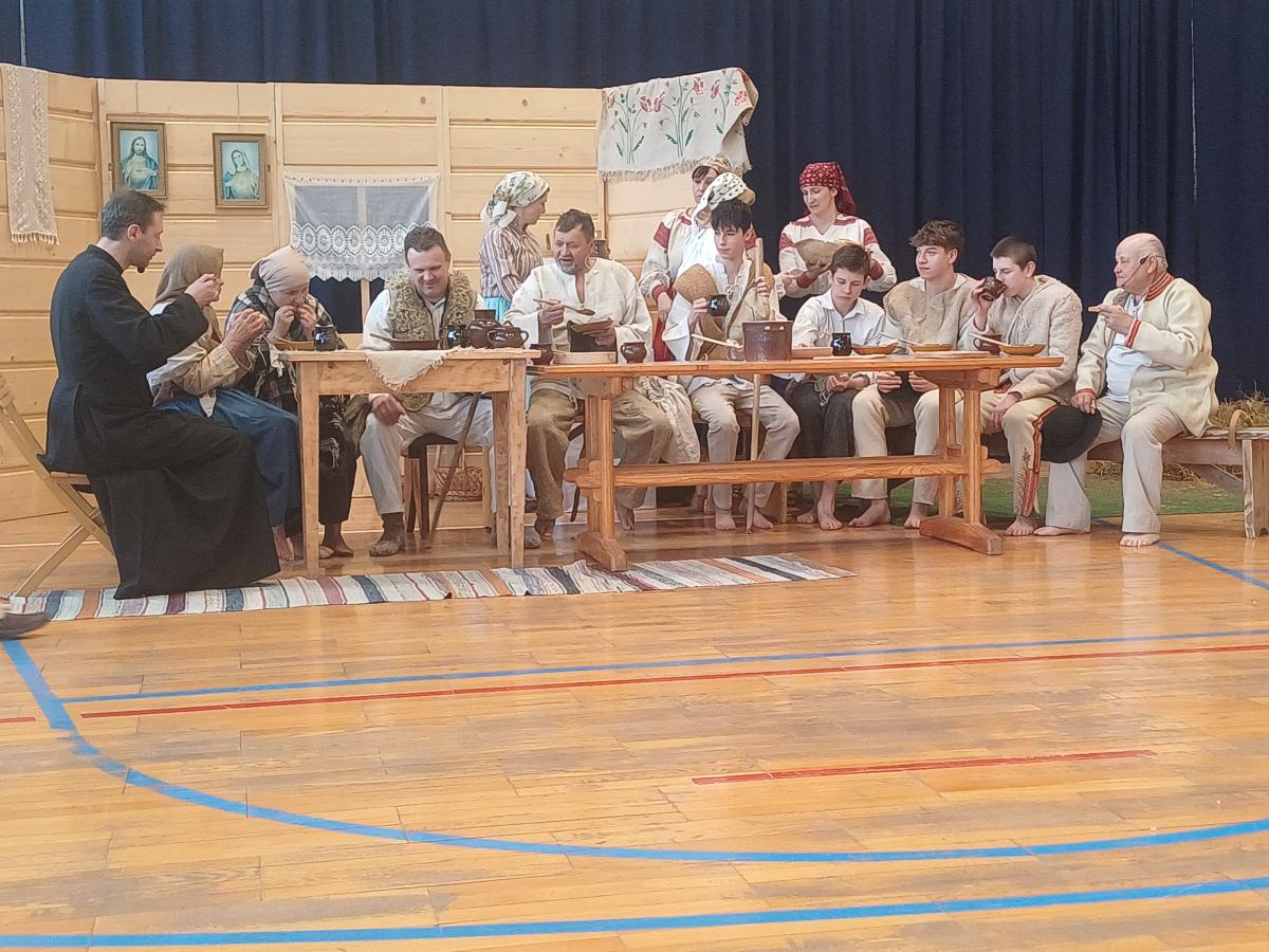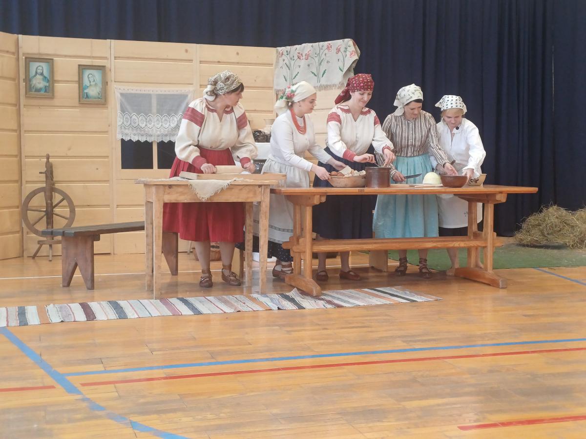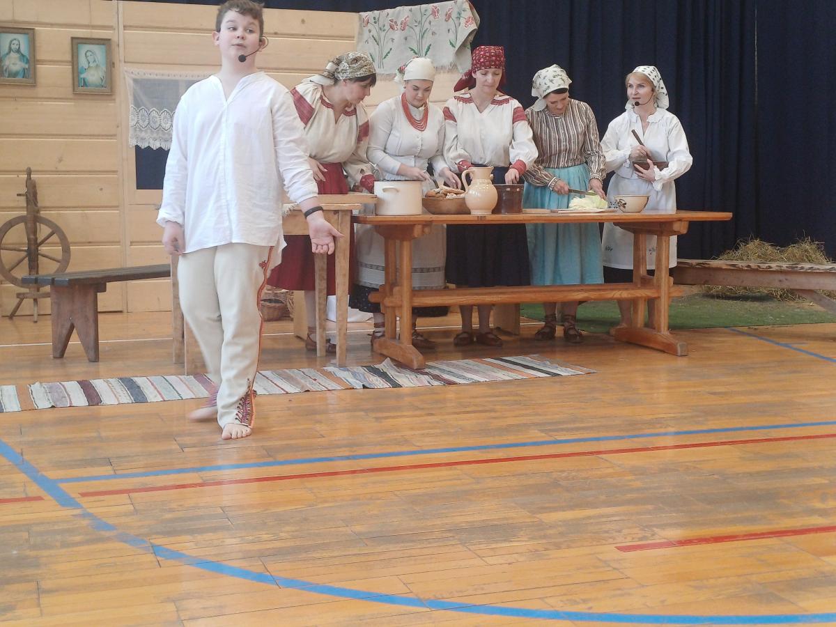 Etap wojewódzki konkursu rozpoczął się przedstawieniem „Bozy obiod”. W rolę aktorów wcielili się mieszkańcy Grywałdu, absolwenci oraz uczniowie naszej szkoły. Przybyłych trąbitą przywitał Jan Kubik. Dyrektor Szkoły Podstawowej w Grywałdzie, pan Władysław Bąk, zwrócił uwagę, że kultywowanie tradycji jest nie tylko obowiązkiem, ale przede wszystkim przywilejem i dumą. Życzył również sukcesów uczestnikom biorącym udział w Konkursie. Głos zabrał także Wójt Gminy Krościenko nad Dunajcem – pan Stanisław Tkaczyk.